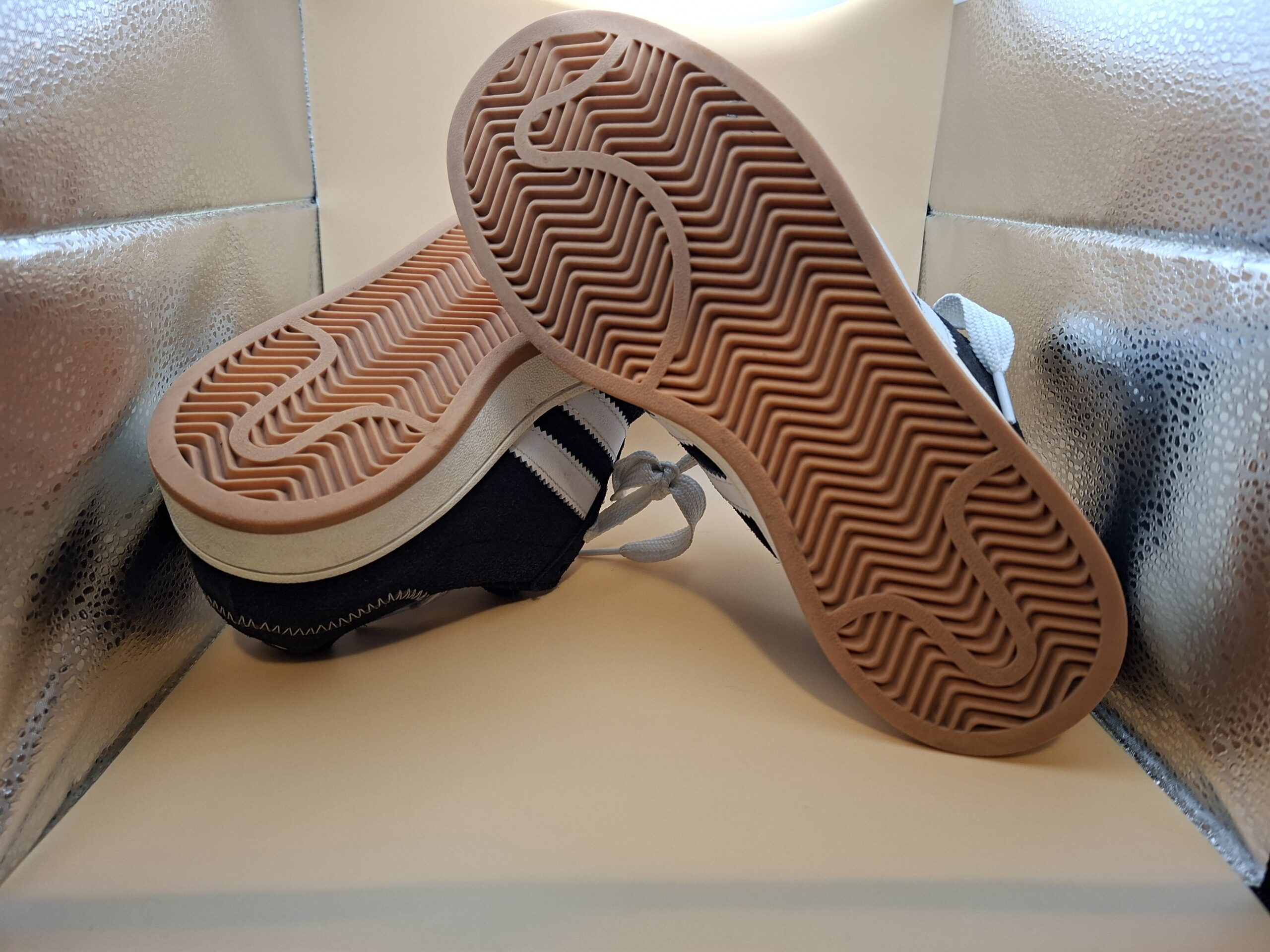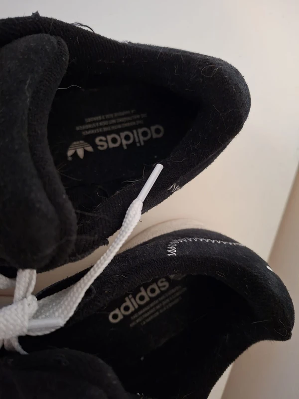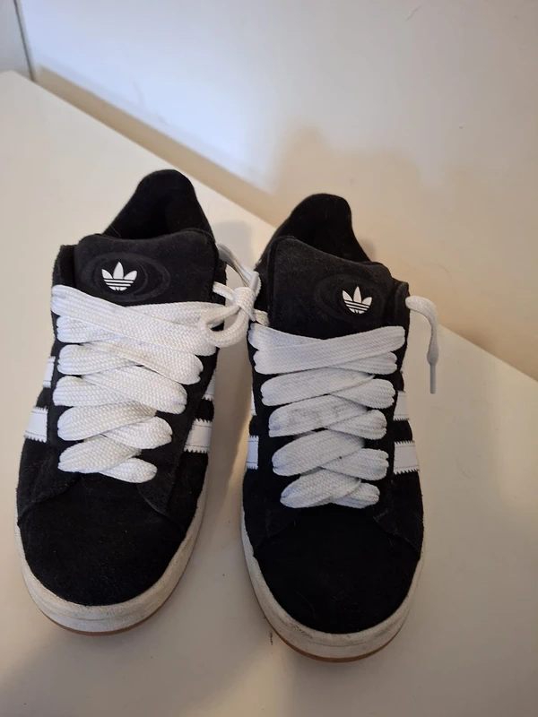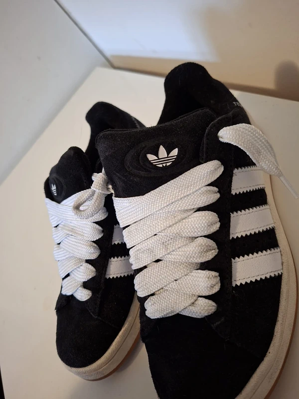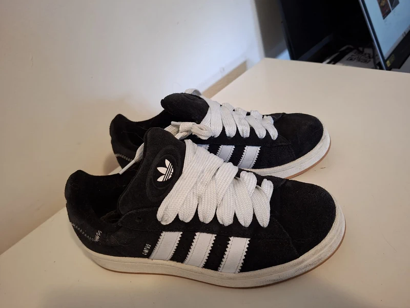Iconische Adidas Campus 00s sneakers in zwart suède, maat 39 1/3. Met de kenmerkende dikke veters en een vintage ‘off-white’ zool. Een klassieker in goede, gedragen staat.