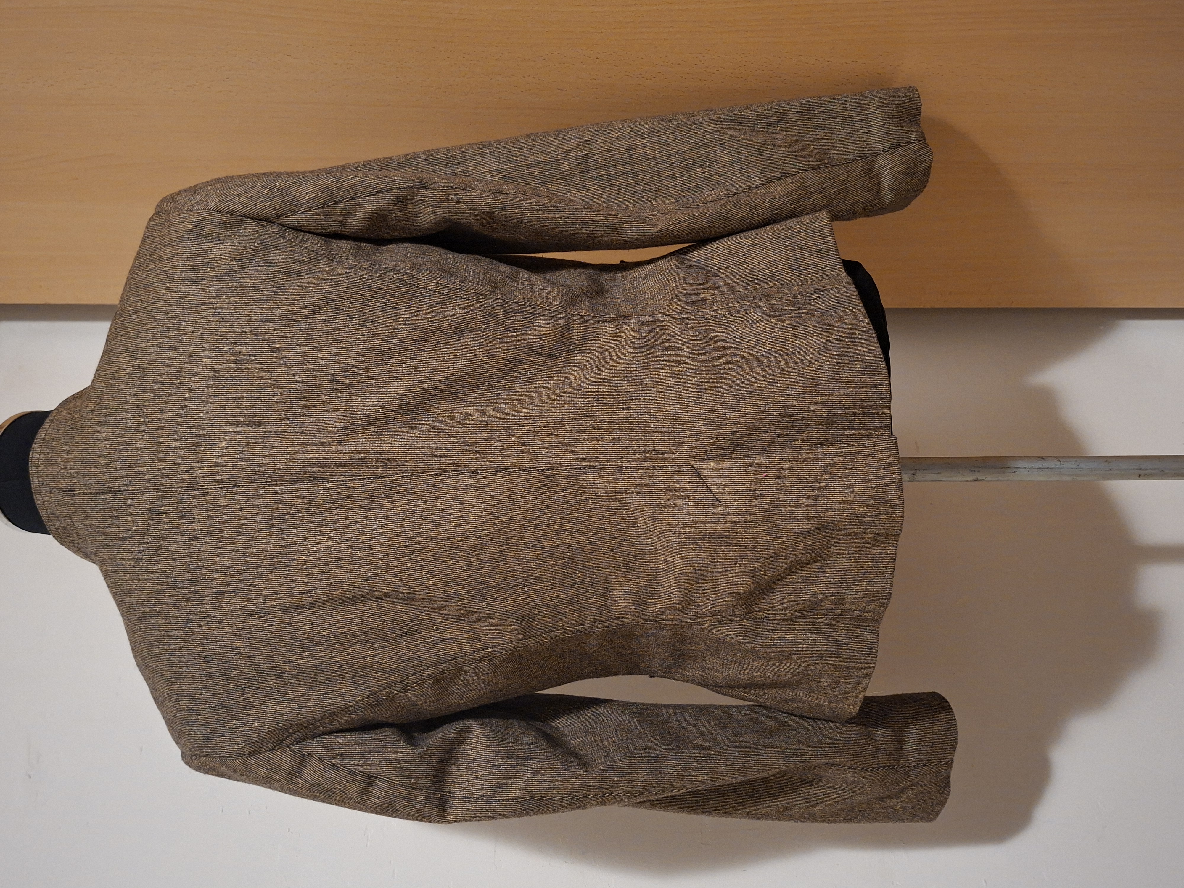 Bruine blazer van Laura di Sarpi. Maat 40. Materiaal: 62% Schurwolle, 18% Polyamid, 10% Seide, 8% Polyester, 2% Elasthan. Prachtige geruitte revers met turquoise accent. Dubbelrij knopen. Vier zakken met klepsluiting. Hoogwaardige wol-zijde mix. Elegant en klassiek model.