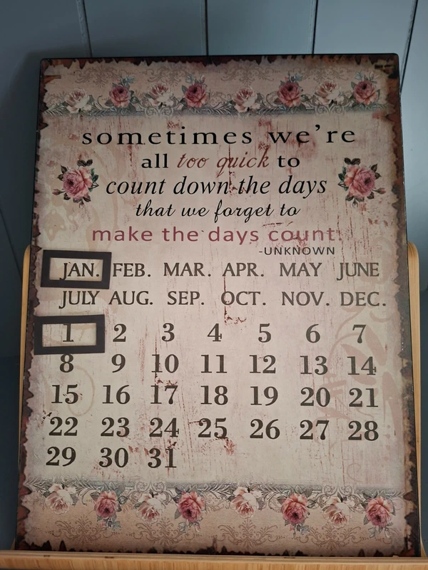 Een sfeervol en inspirerend decoratiebord voor in huis. Dit houten bord functioneert als een eeuwigdurende kalender, waarbij je met twee verschuifbare, magnetische kaders de juiste maand en dag kunt aangeven. Het bord heeft een romantische, vintage uitstraling met een verweerde look, rozen en een mooie spreuk: