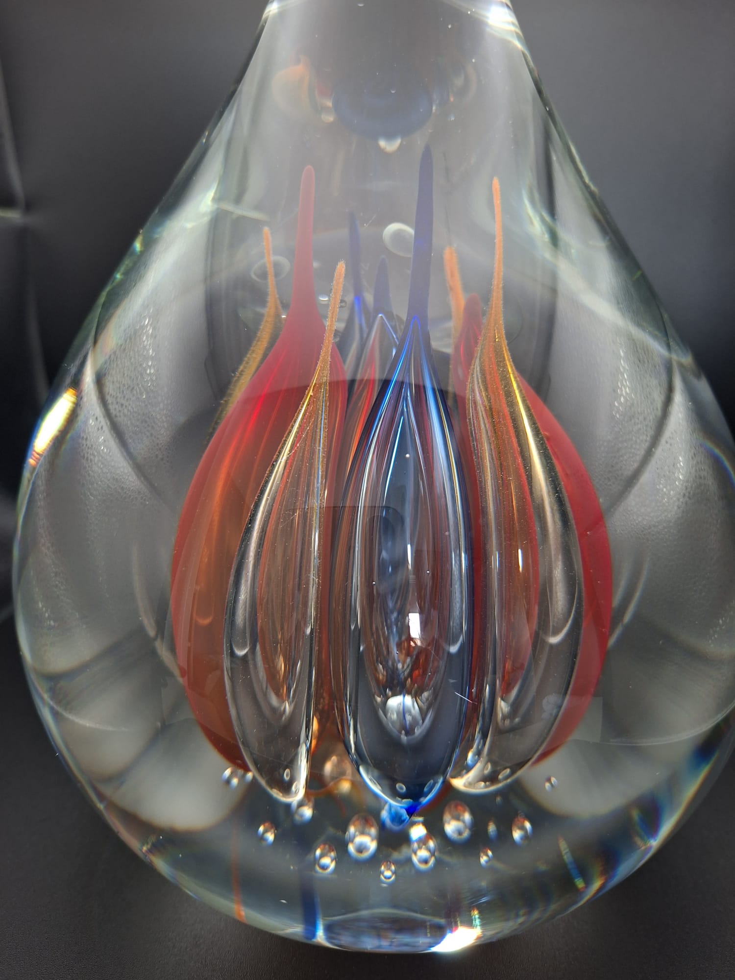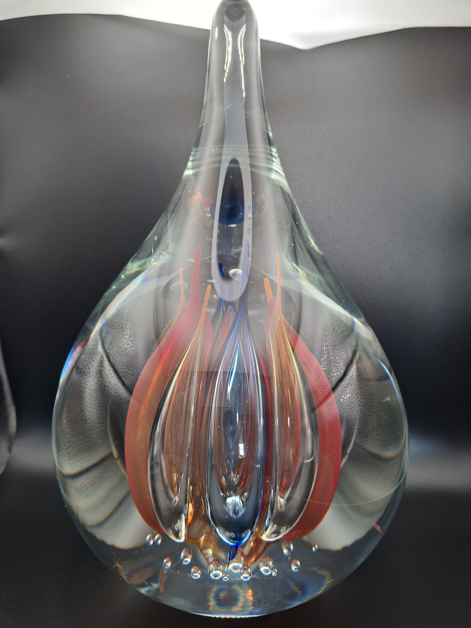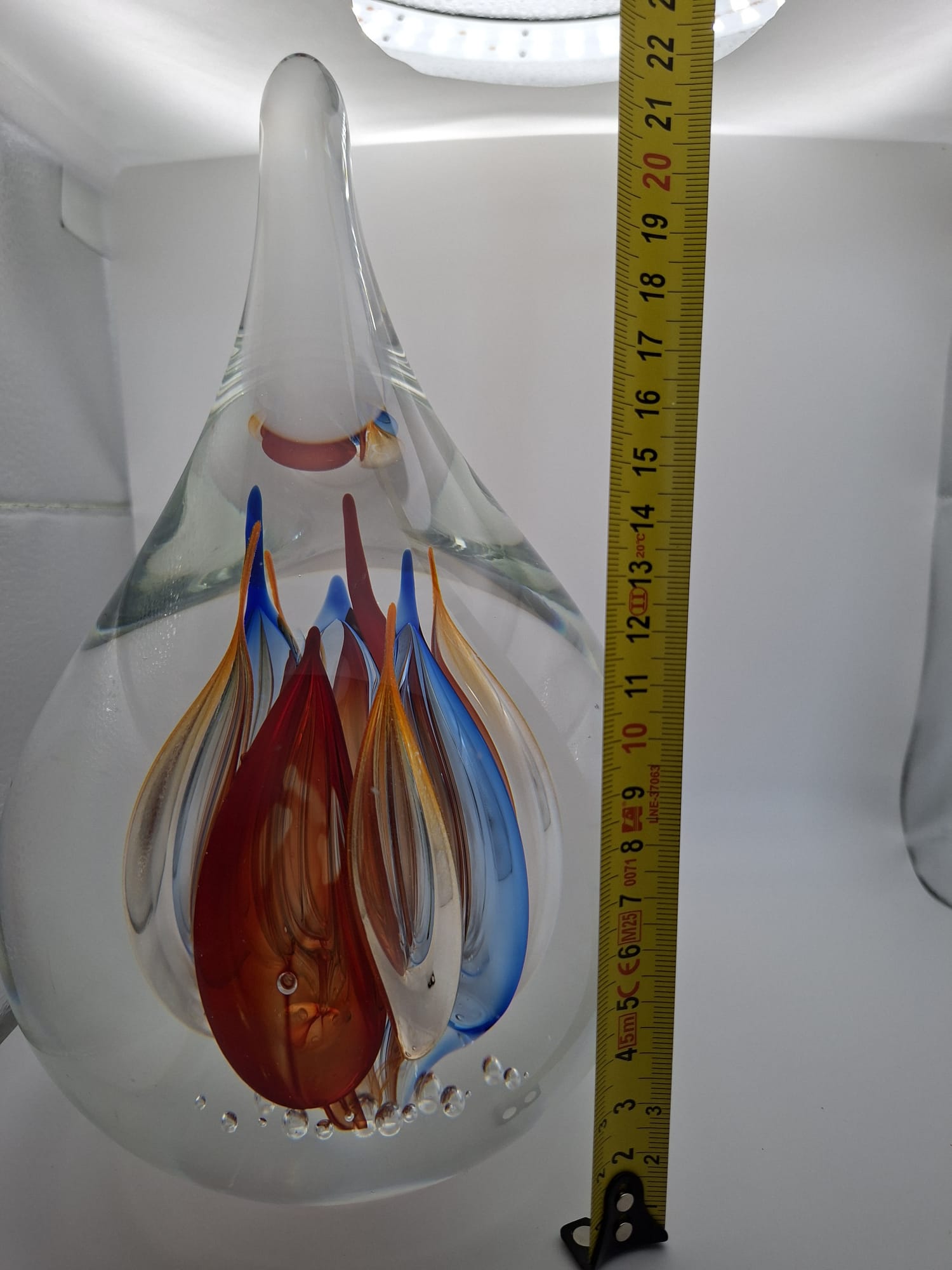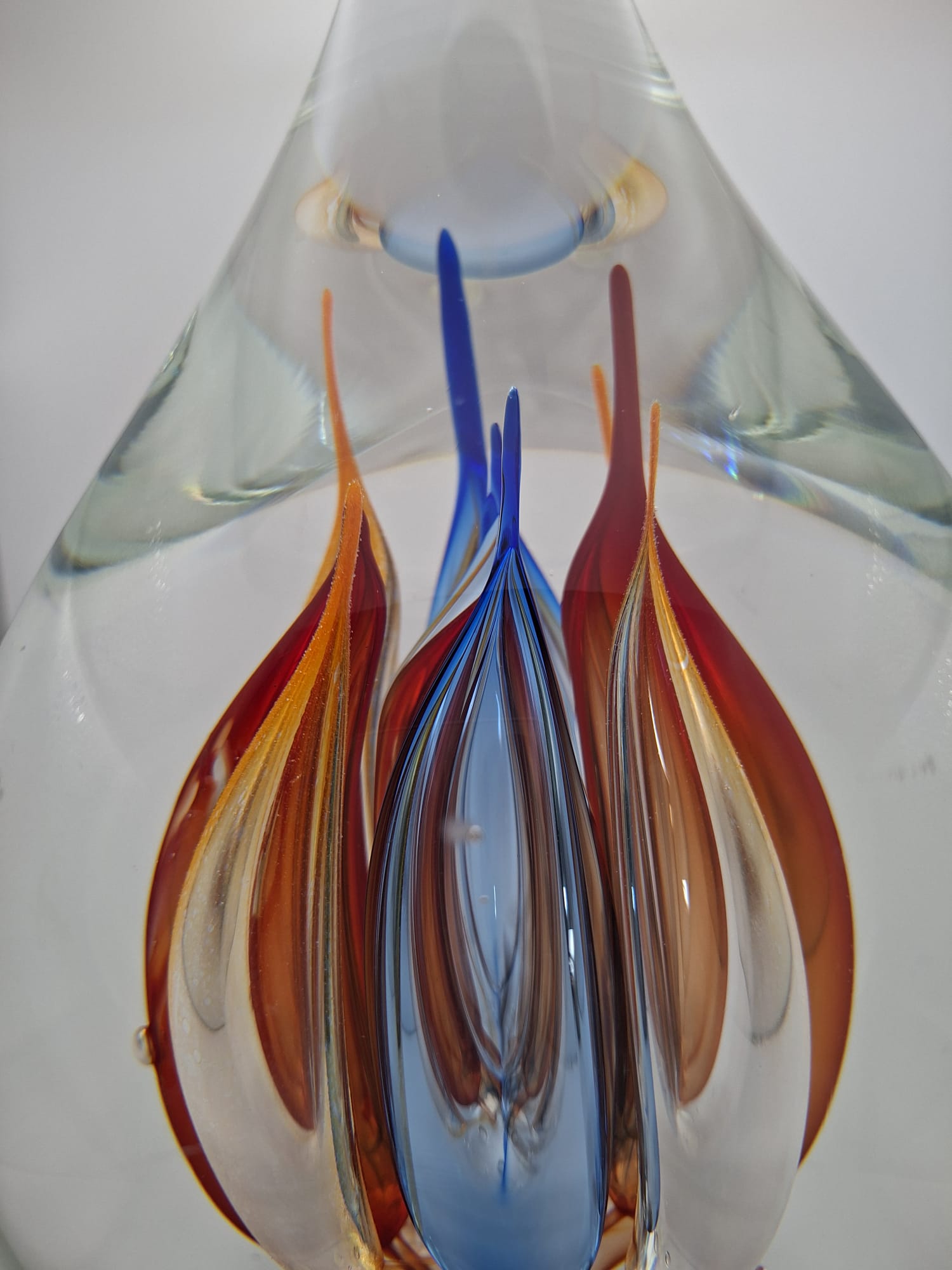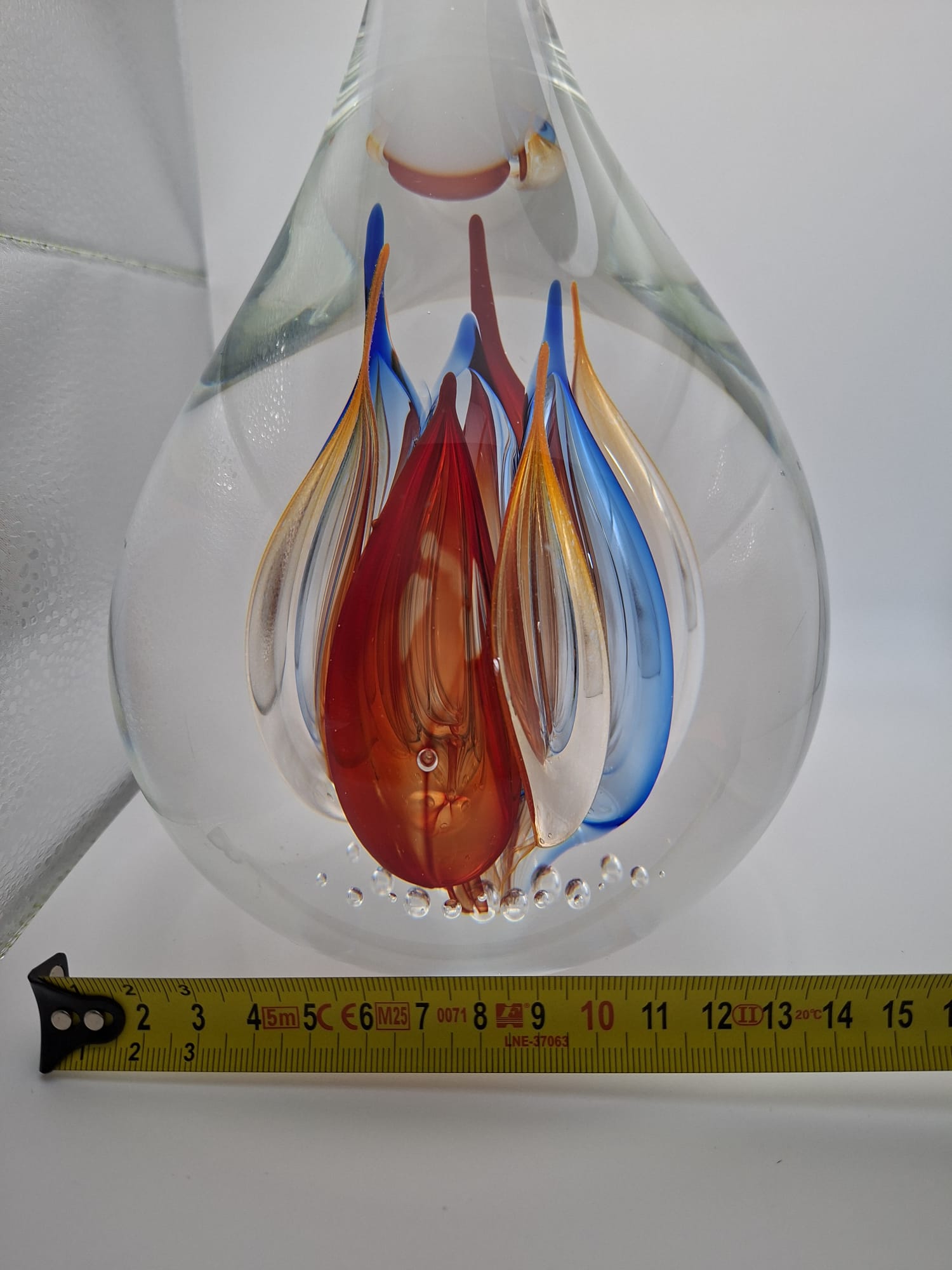 Het object is 22 cm hoog en heeft een schitterend ‘gevangen vlam’ patroon van rood, oranje en blauw glas. Het is in perfecte staat, zonder chips. Een echt statement piece!