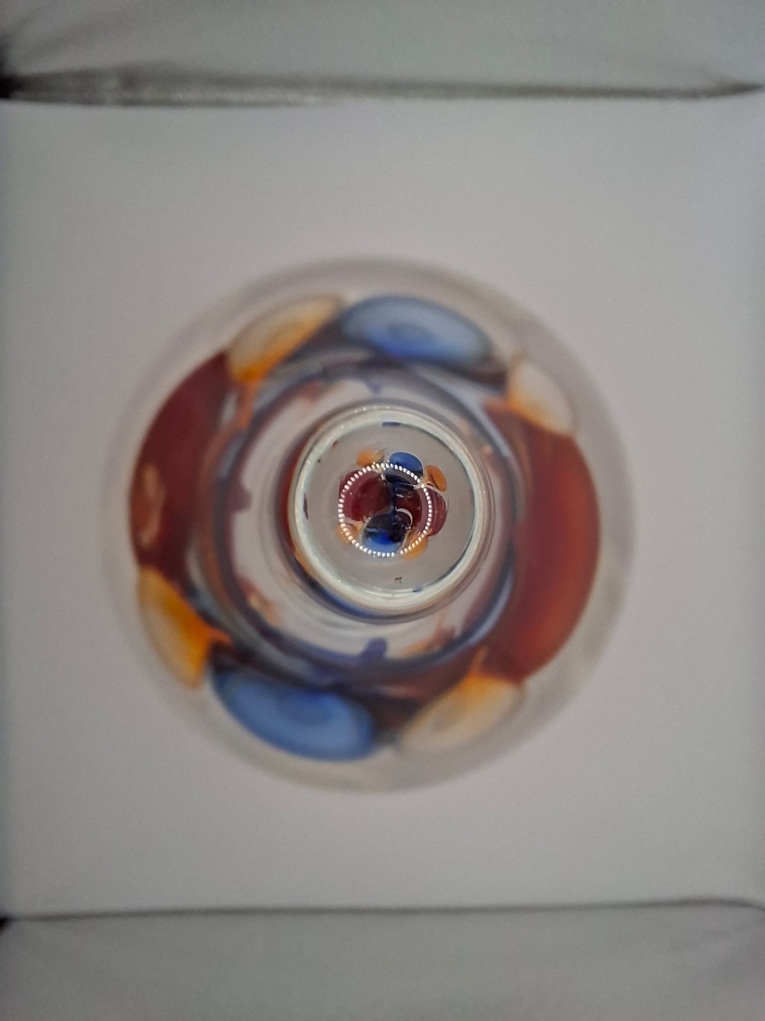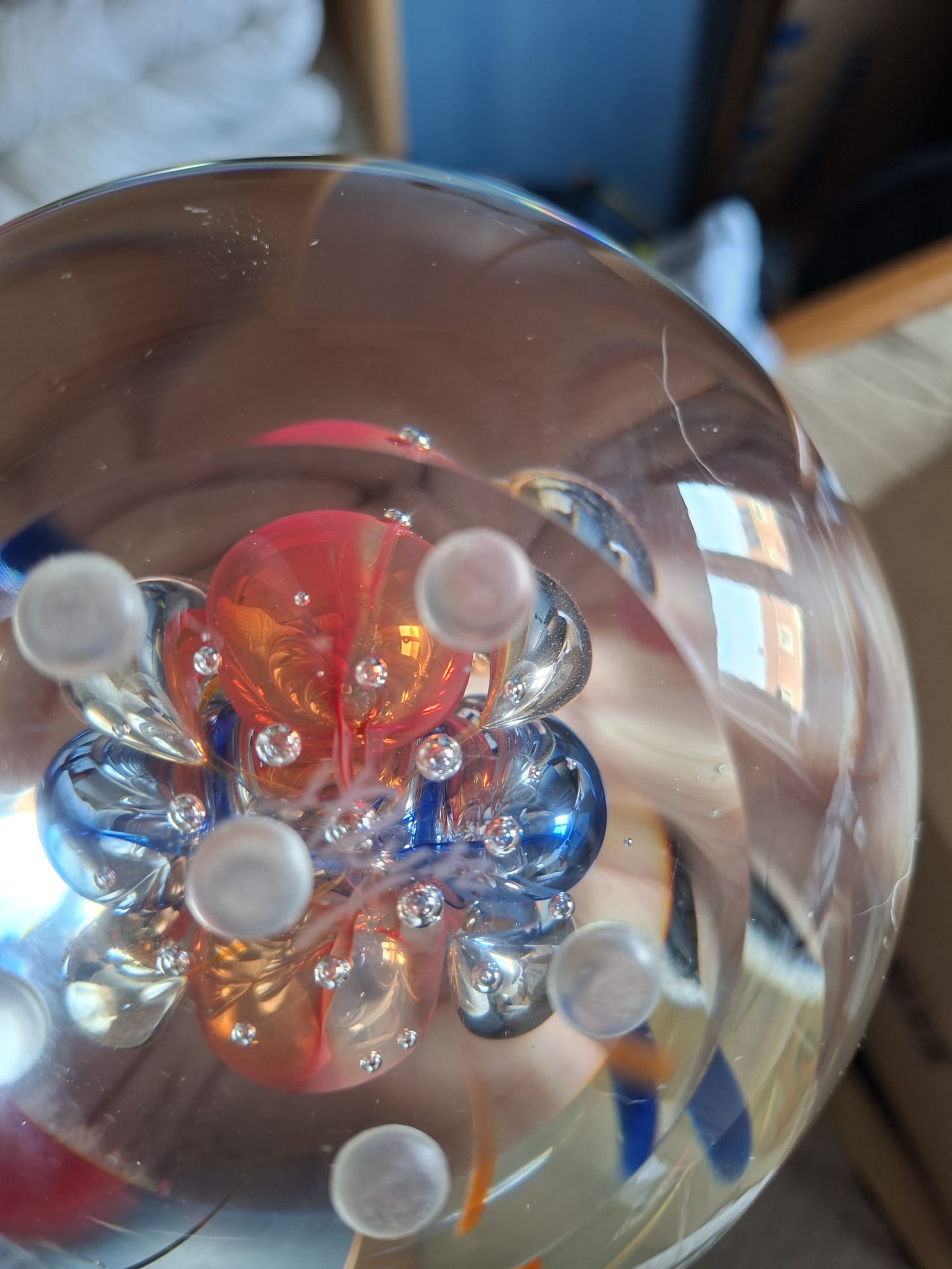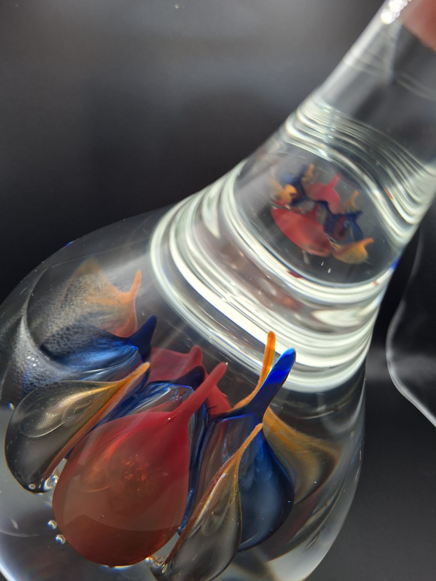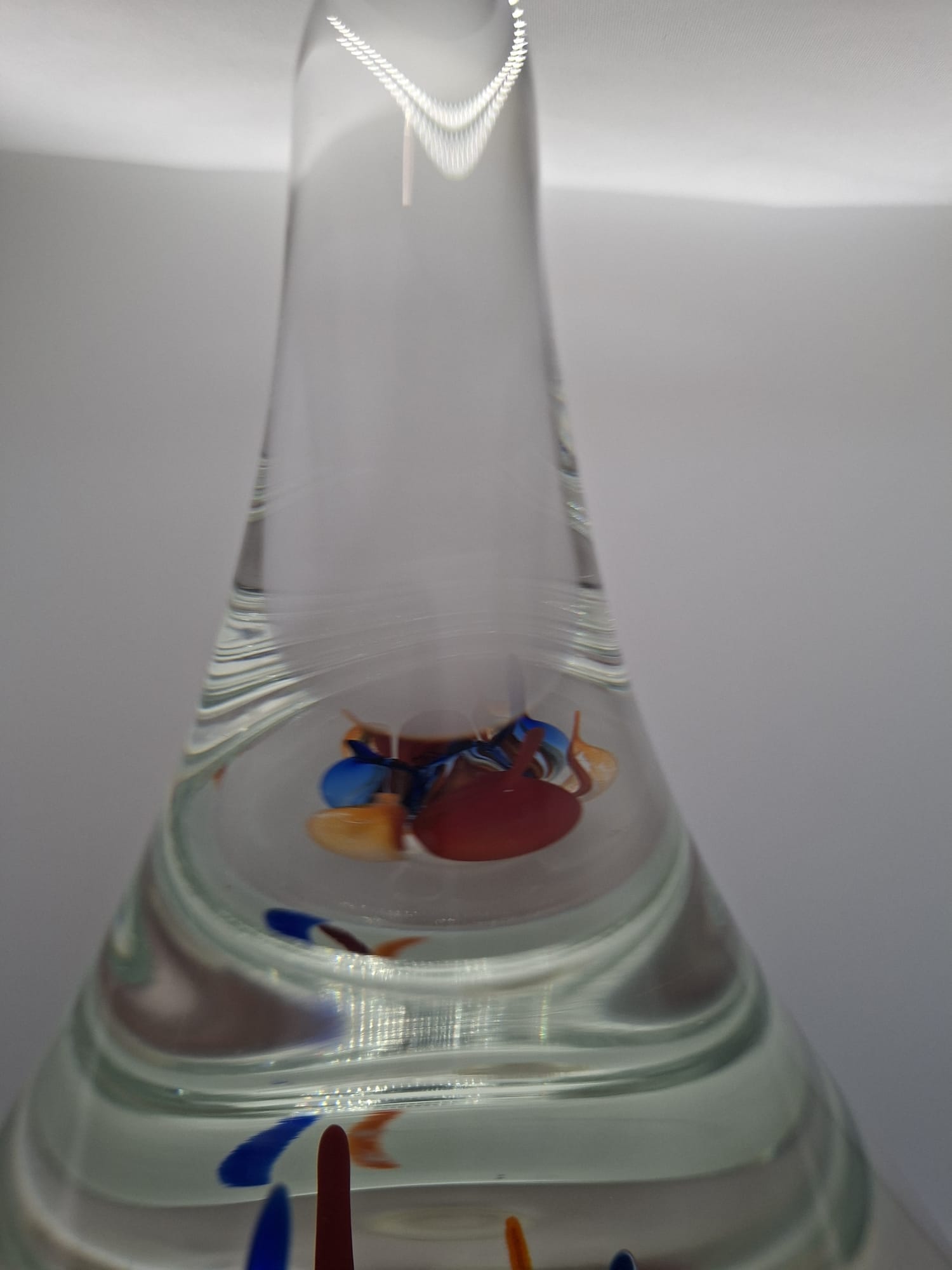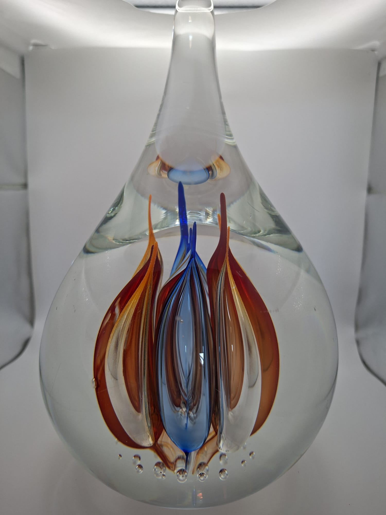 Het object is 22 cm hoog en heeft een schitterend ‘gevangen vlam’ patroon van rood, oranje en blauw glas. Het is in perfecte staat, zonder chips. Een echt statement piece!