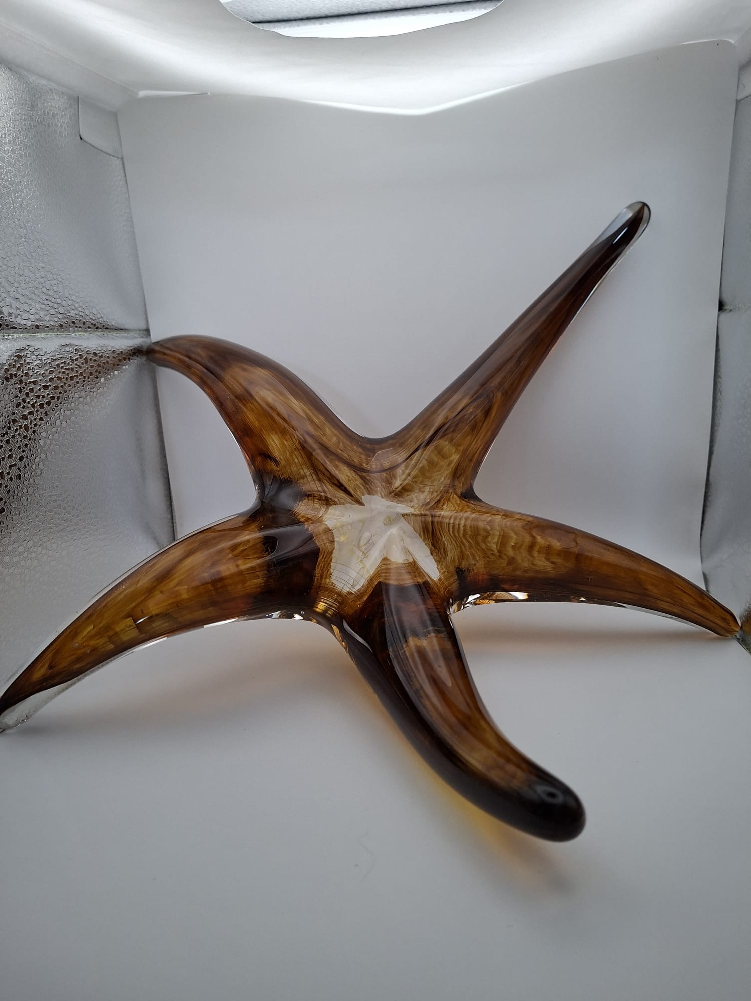 Deze schaal is uitgevoerd in prachtige aardetinten, waarbij stromen van amber- en donkerbruin glas door het heldere kristal lijken te vloeien. Dit geeft het object een warme, natuurlijke en bijna levende uitstraling. De dynamische, opstaande armen van de zeester maken het een sculpturaal object dat vanuit elke hoek boeit.