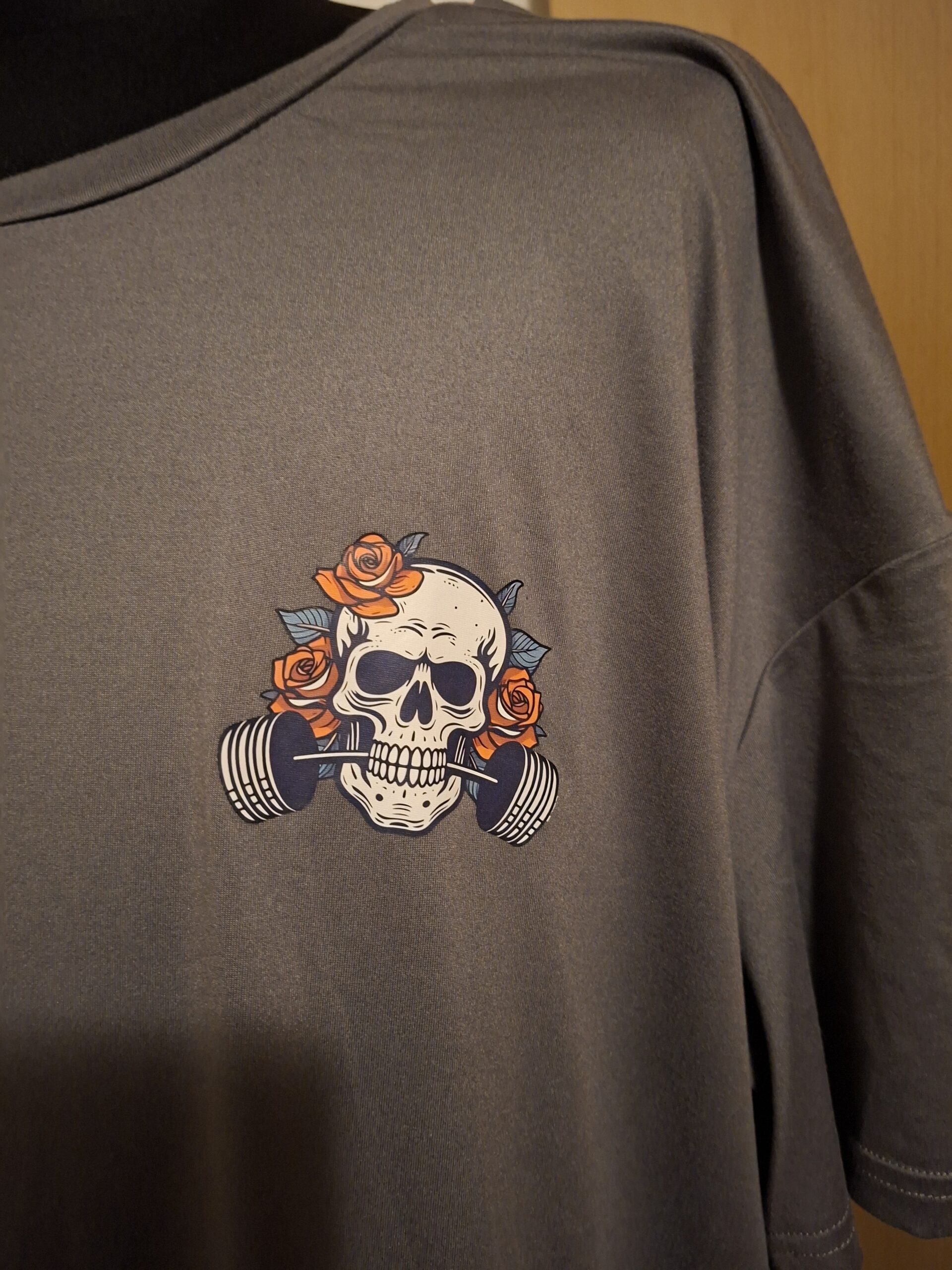 Grappige fitness statement met humor. Oversized comfortabele fit. Prachtige kleurrijke print met schedel, rozen en halters. Geschikt voor dames die van fitness en humor houden.