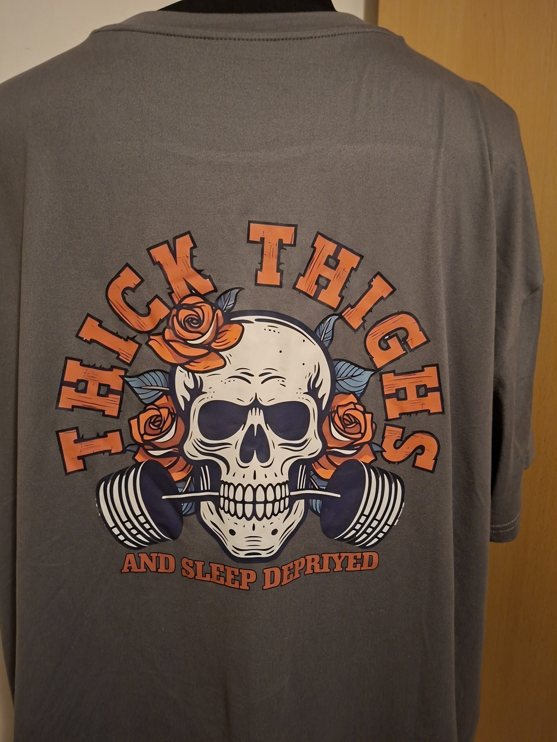 - Print achterkant: THICK THIGES AND SLEEP DEPRIVED met schedel (groot)