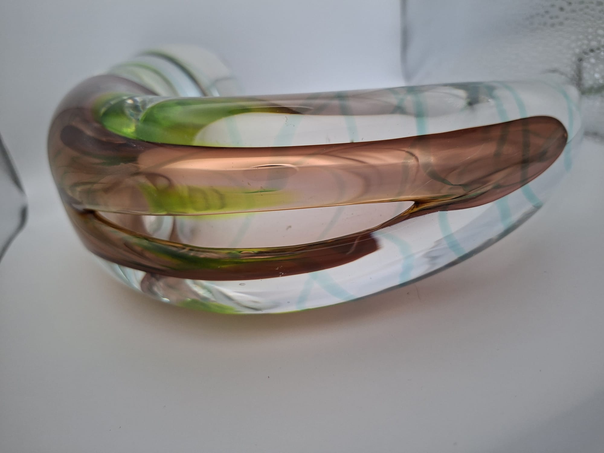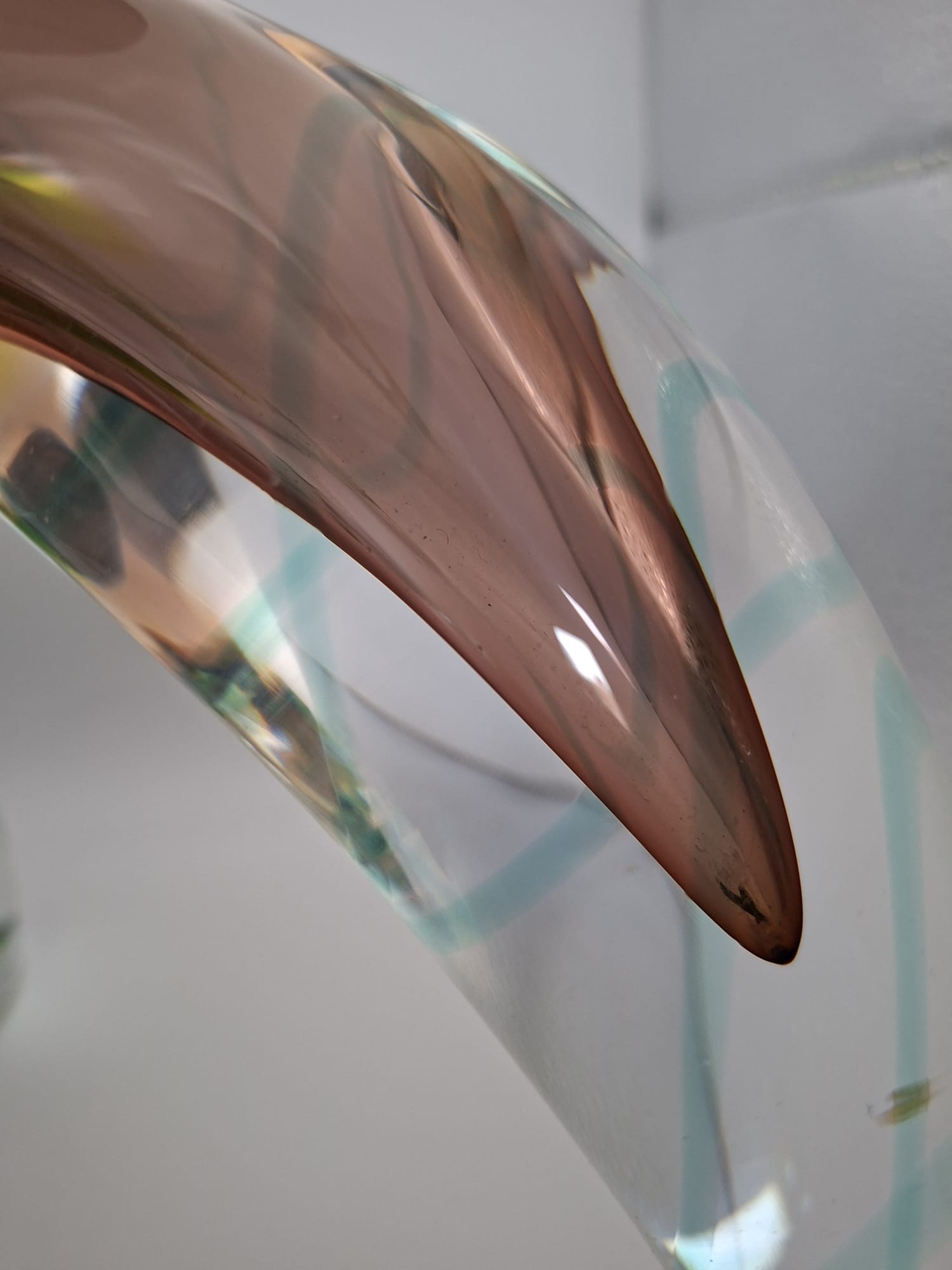 Een spectaculaire, grote (24 cm breed) en zware Murano glas sculptuur in een boogvorm. Dit unieke, handgemaakte kunstobject combineert Sommerso en Filigrana technieken en is in uitstekende staat. Een waar statement piece.