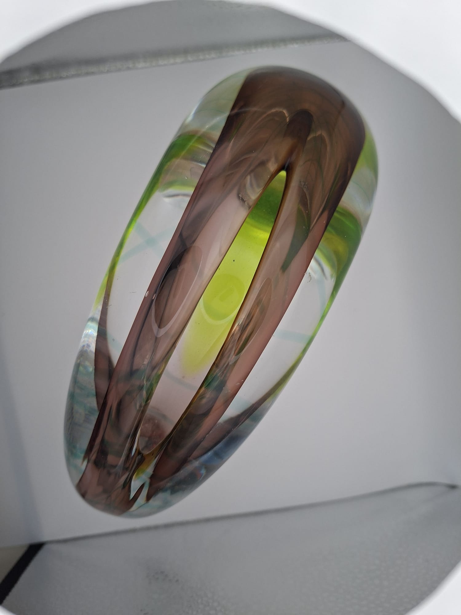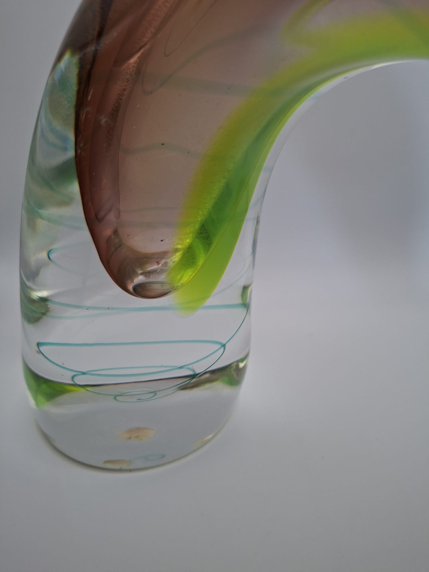Het kunstwerk combineert meerdere complexe technieken. Een kern van roze/bruin en limoengroen glas is via de Sommerso-techniek ingesloten in het massieve, heldere kristal. Het object is verder versierd met delicate, meedraaiende blauwe glasdraden (filigrana) aan de ene kant, en contrasterende verticale strepen aan de andere. Deze combinatie van technieken en de vloeiende, sculpturale vorm getuigen van uitzonderlijk vakmanschap.