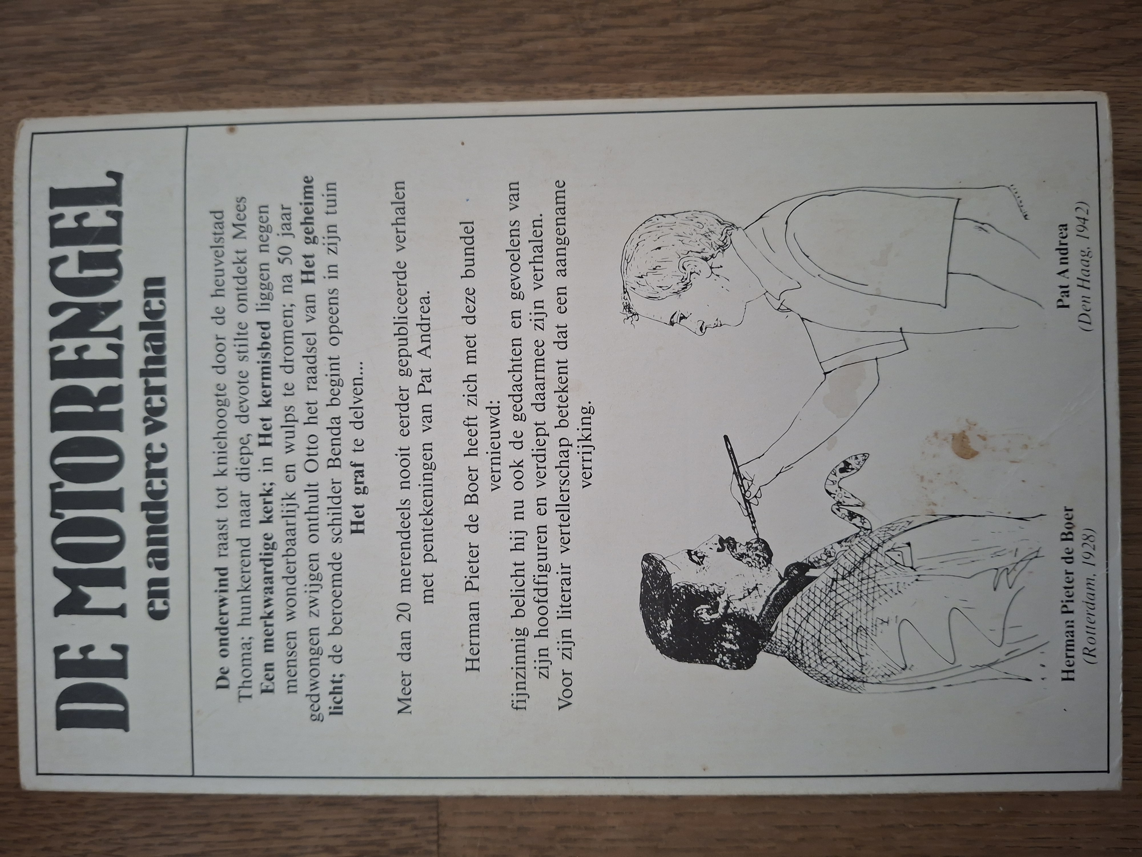 De Motorengel en andere verhalen van Herman Pieter de Boer is een bijzondere verhalenbundel met meer dan 20 merendeels nooit eerder gepubliceerde verhalen met pentekeningen van Pat Andrea. Dit is een unieke samenwerking tussen twee kunstenaars: Herman Pieter de Boer (Rotterdam, 1928) als schrijver en Pat Andrea (Den Haag, 1942) als illustrator.