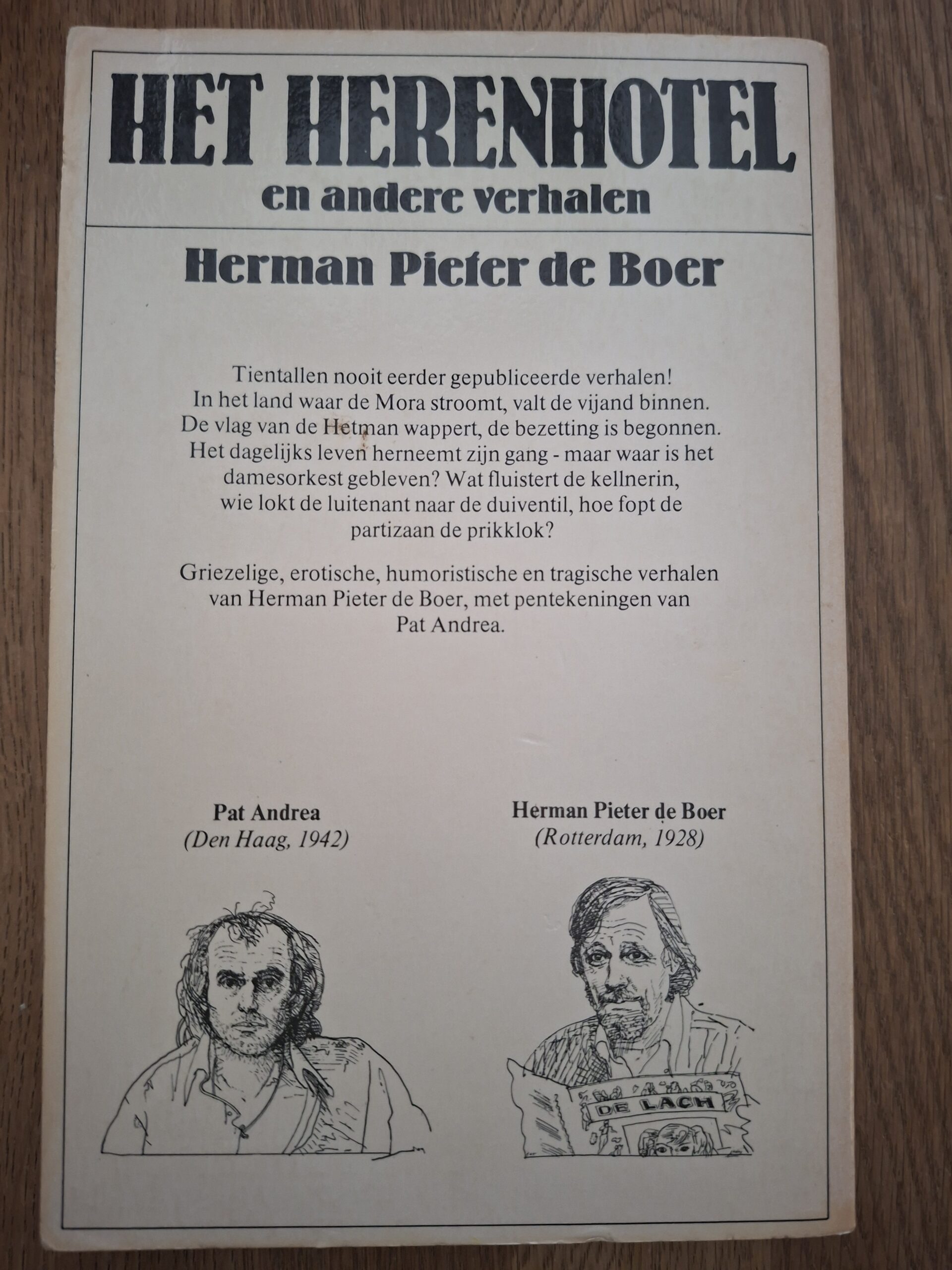 Het Herenhotel en andere verhalen van Herman Pieter de Boer is een fascinerende verhalenbundel met tientallen nooit eerder gepubliceerde verhalen! Dit is wederom een unieke samenwerking tussen schrijver Herman Pieter de Boer (Rotterdam, 1928) en kunstenaar Pat Andrea (Den Haag, 1942), die de verhalen voorziet van pentekeningen.