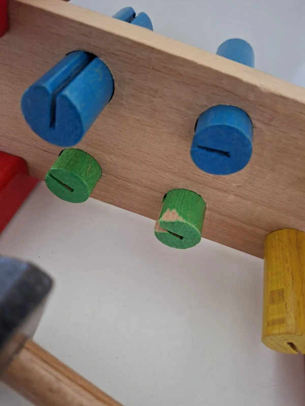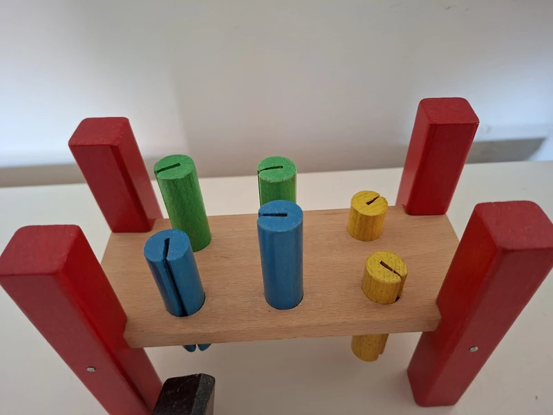 Let op: Dit item is in een gebruikte, bespeelde staat. Zoals te zien op de foto’s, zijn er duidelijke gebruikssporen, met name op de hamer en de pinnen waar de verf wat afgesleten is. Dit doet niets af aan de functionaliteit en het speelplezier, maar de prijs is hierop aangepast.