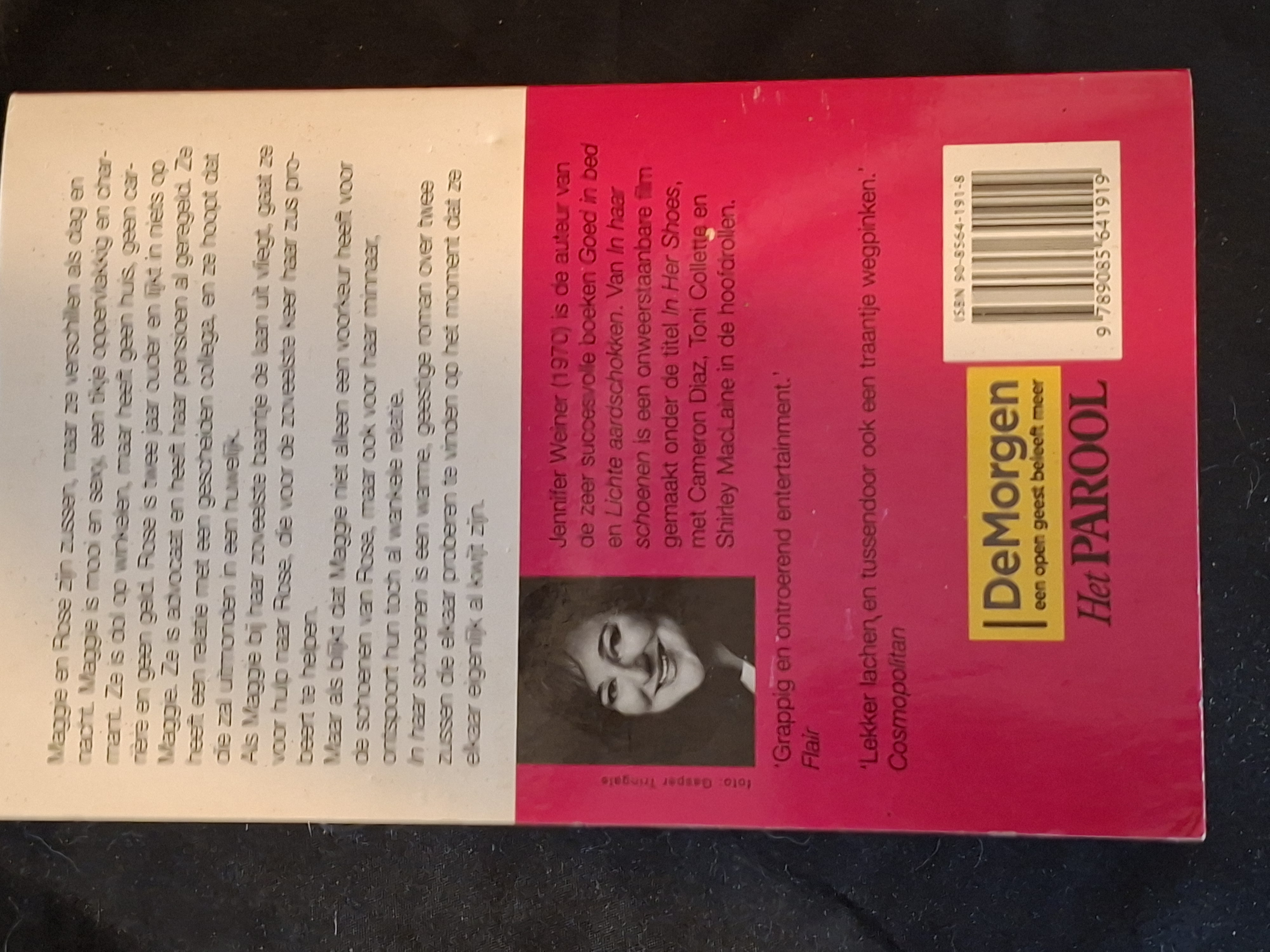 In Haar Schoenen van Jennifer Weiner. Warme roman over twee zussen Maggie en Rose. Verfilmd met Cameron Diaz. Het Parool Chicklit. Fictie.