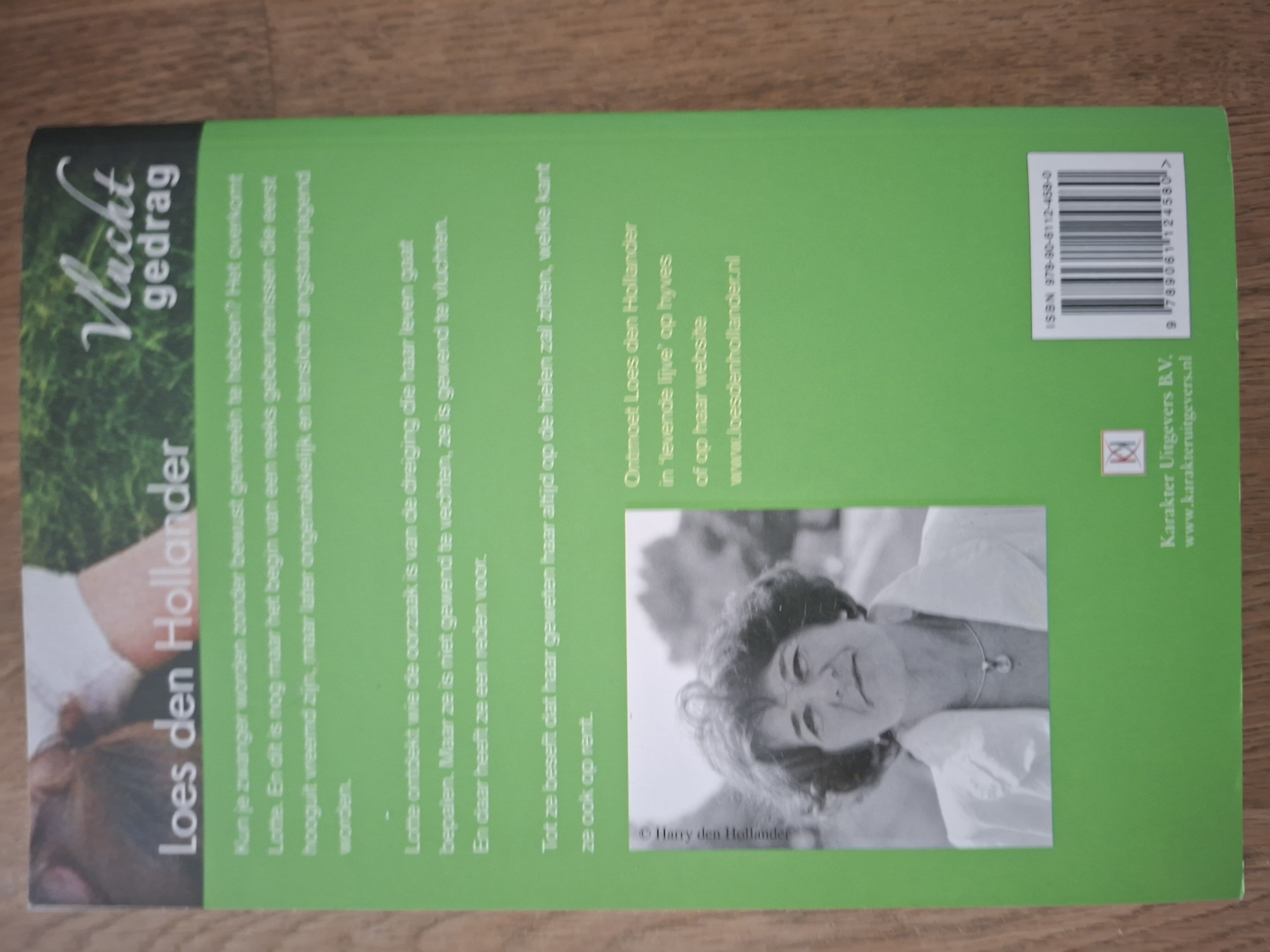 Loes den Hollander is een Nederlandse schrijfster die literaire thrillers schrijft met psychologische diepgang. Dit boek heeft een intrigerende omslag met een vrouw in wit shirt liggend op groen gras, wat een gevoel van kwetsbaarheid en spanning oproept. Op de achterkant staat een portretfoto van de auteur met haar karakteristieke krullen. De opvallende groene achterkant met website informatie maakt dit een herkenbare uitgave van Karakter Uitgevers.