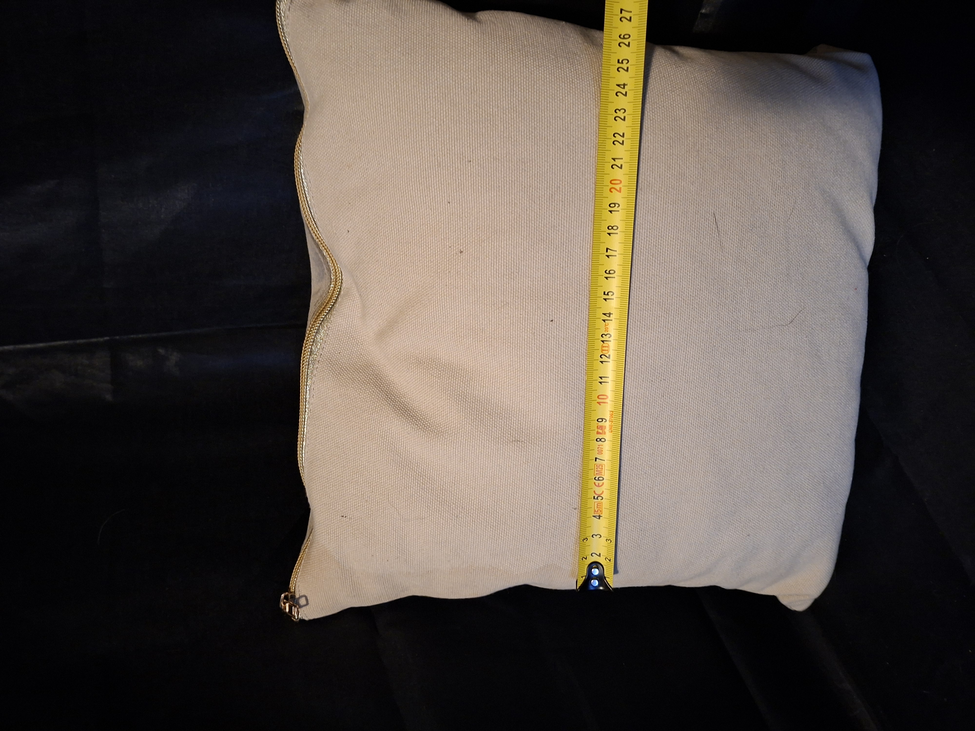 Een zachte, vierkante kussenhoes in een neutrale beige/taupe kleur met een subtiele suède-look textuur aan de voorkant en een stevige canvas-achtige achterkant. De hoes is afgewerkt met een opvallende goudkleurige rits aan de bovenzijde, wat zorgt voor een moderne en luxe uitstraling. Ideaal om een bank of stoel snel een nieuwe, warme sfeer te geven.