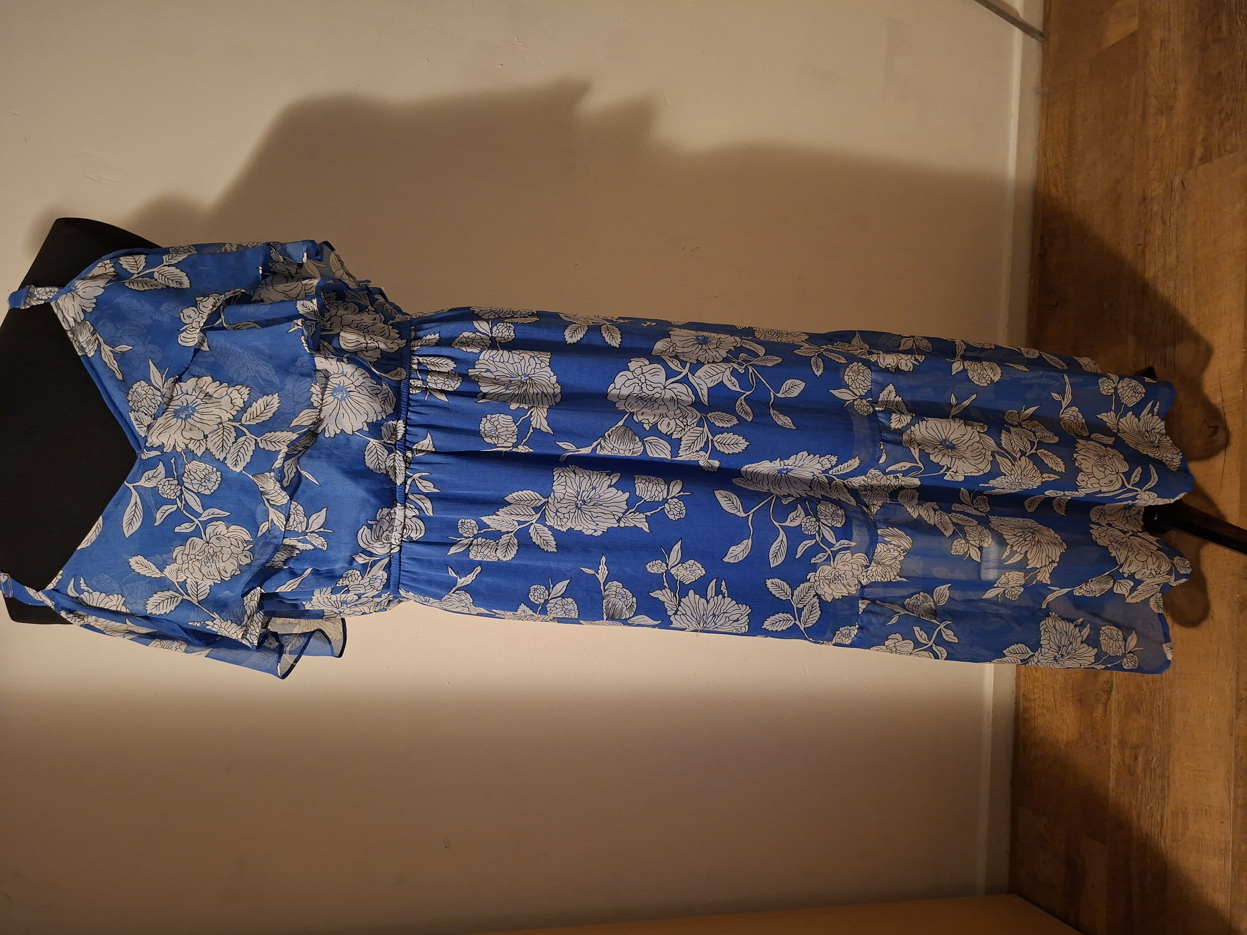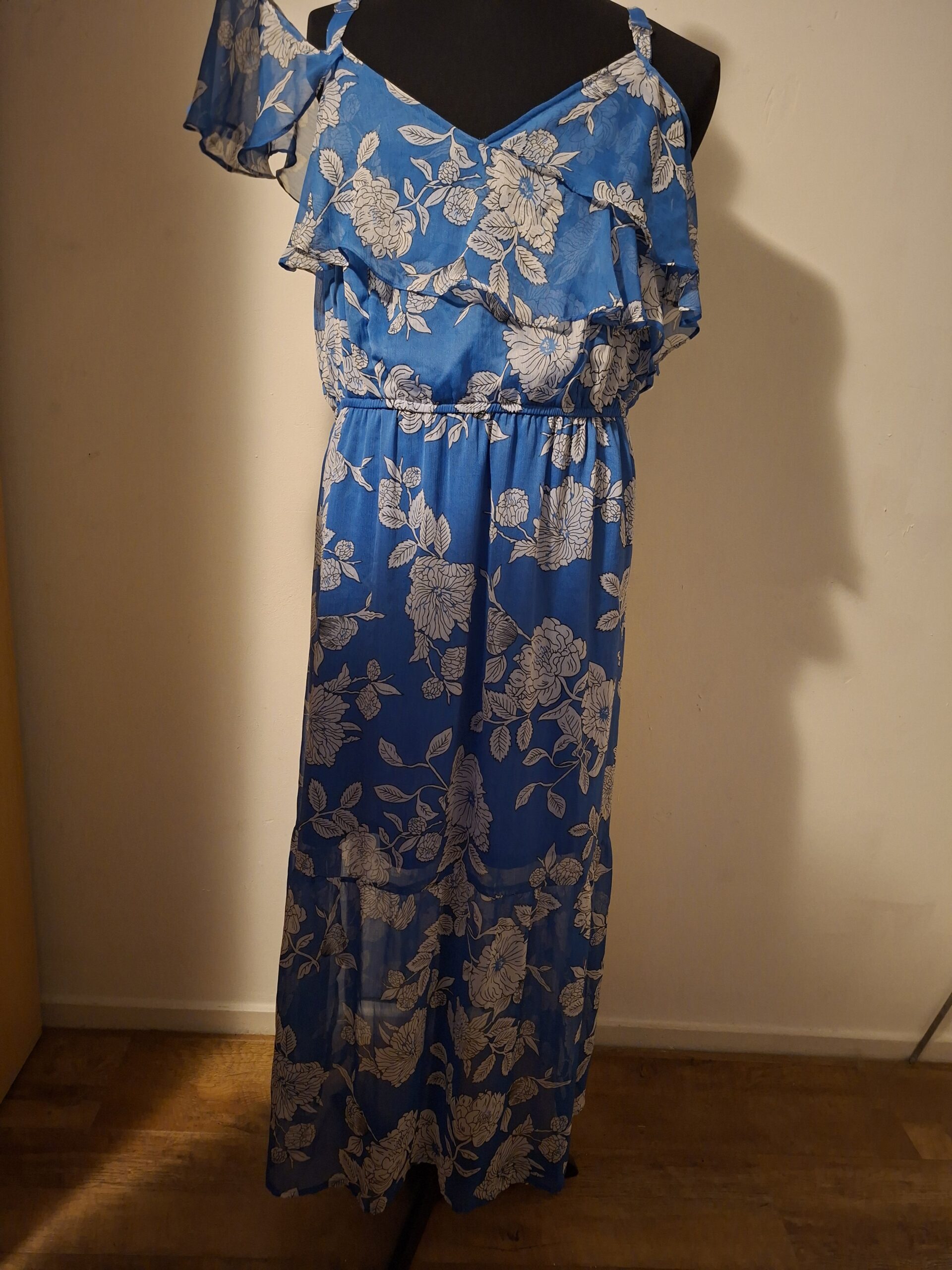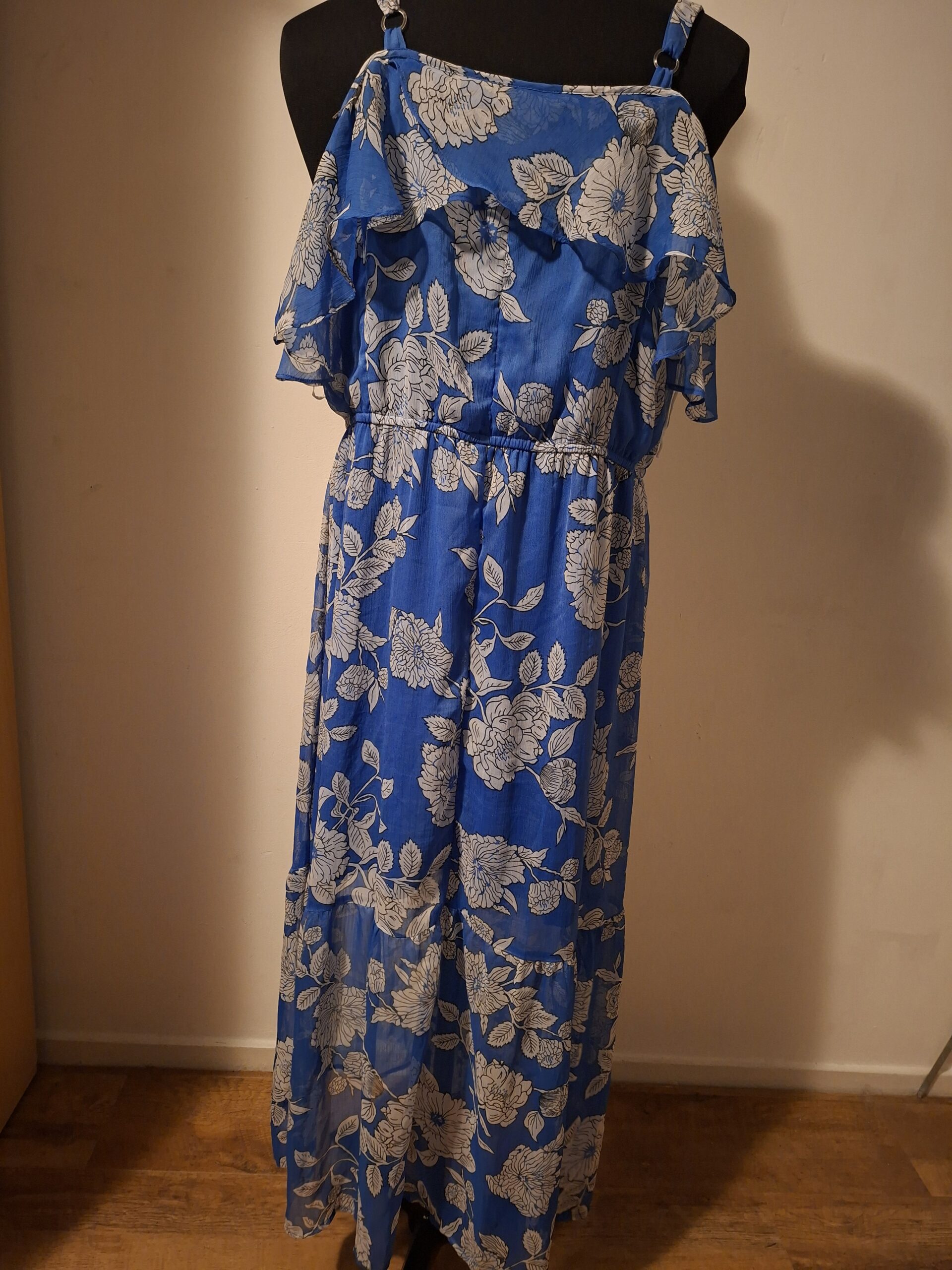 Maxi jurk BPC Selection blauw bloemenprint. Cold shoulder. Maat 48.