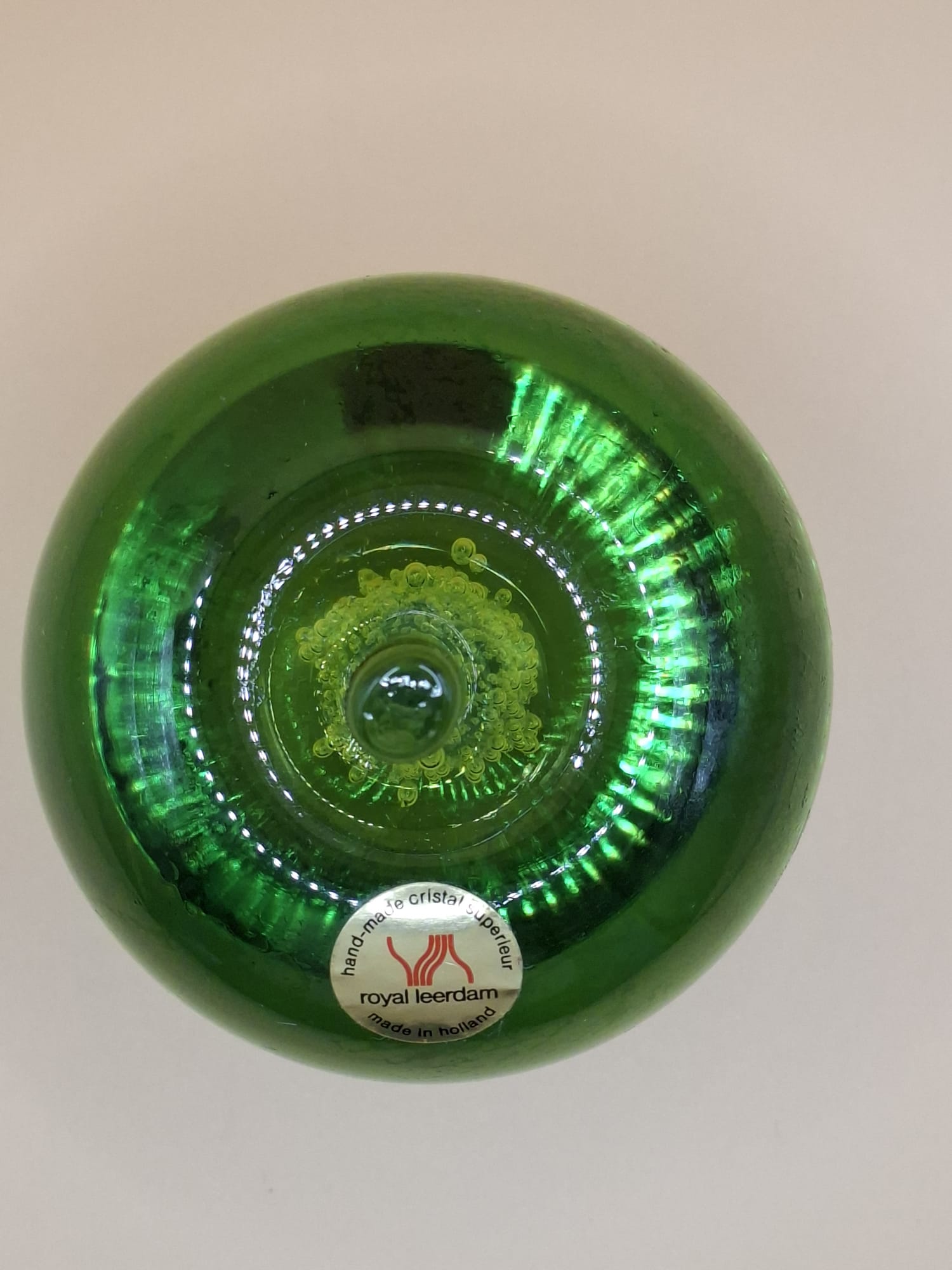 Een iconisch stuk Nederlands design: de handgemaakte kristalglazen appel van Royal Leerdam. Dit prachtige, zware object is uitgevoerd in een levendige groene kleur en draagt nog de originele “Royal Leerdam – Cristal Superieur” kwaliteitssticker.