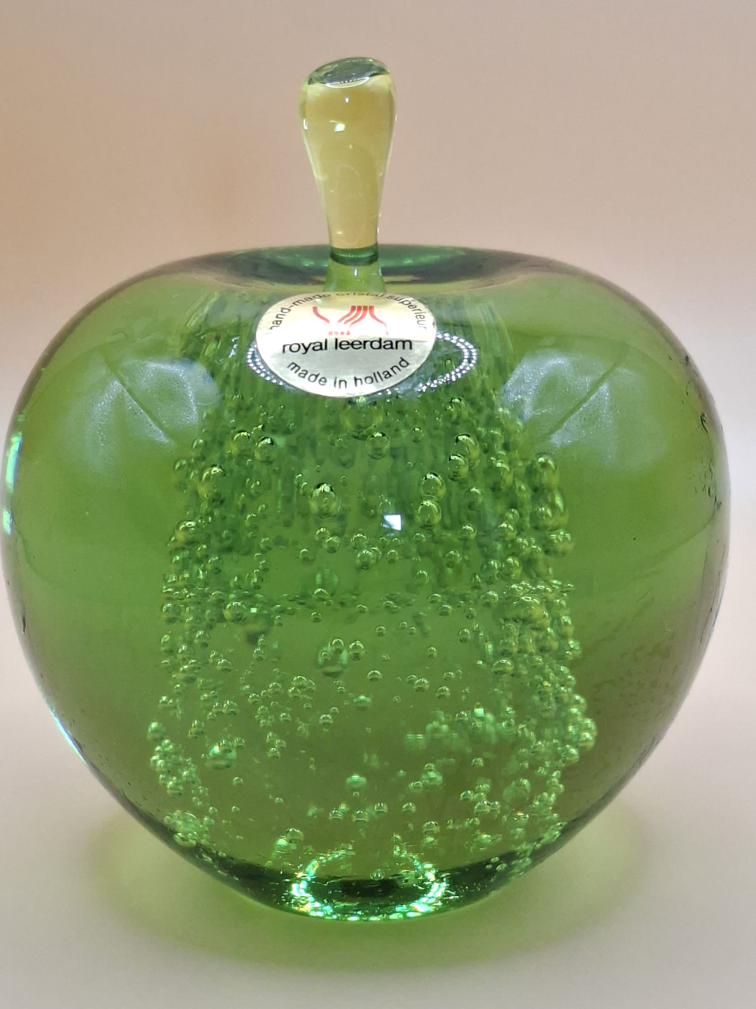 Een klassieke, handgemaakte glazen appel van Royal Leerdam. Dit zware, groene kristalobject (9,5 cm) heeft een ‘bruisende’ kern van luchtbelletjes en de originele sticker. In uitstekende staat.