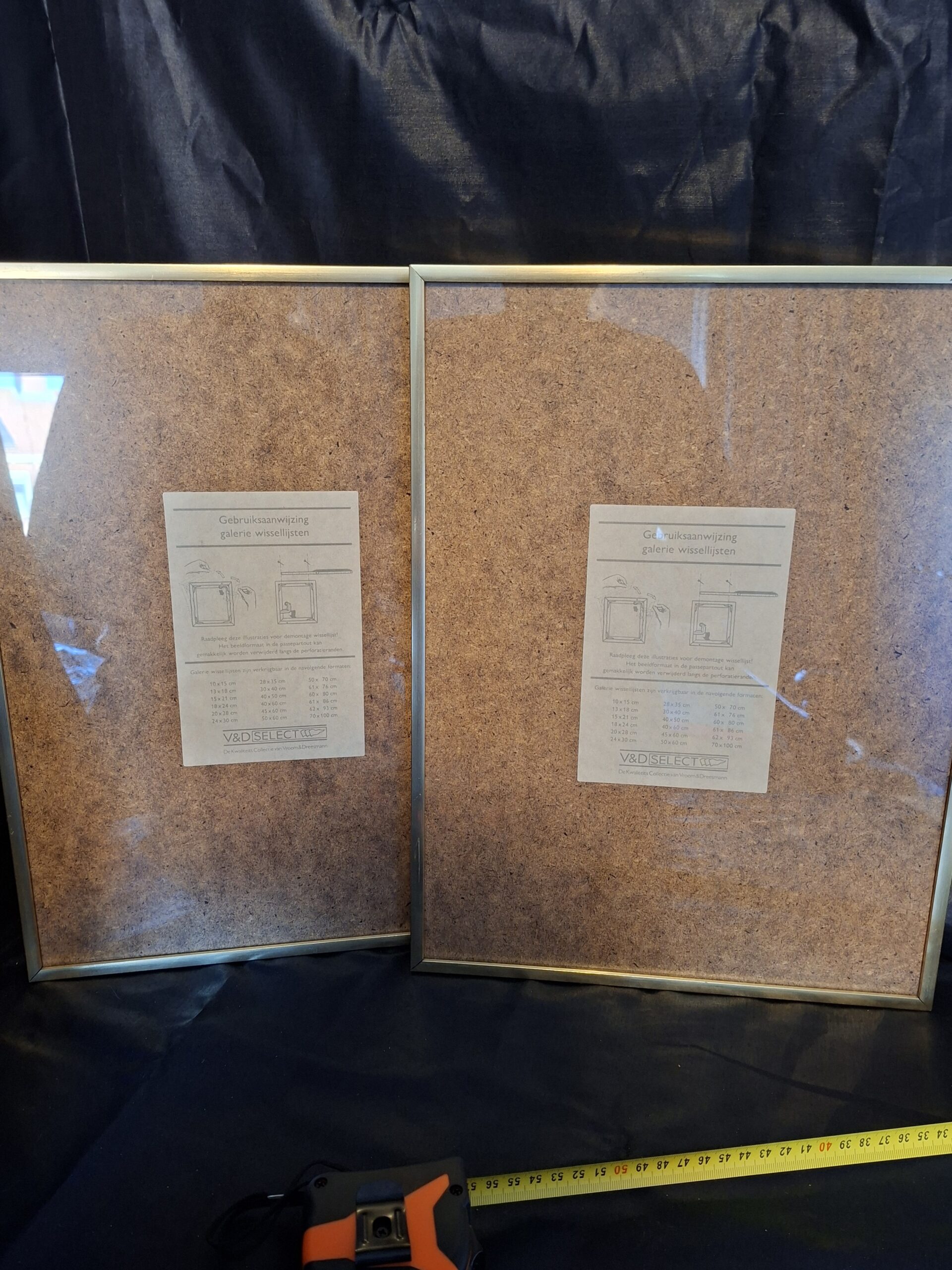 Set van 2 goudkleurige galeriewissellijsten van V&D Select. Formaat 30×40 cm. Zeer goede, ongebruikte staat.