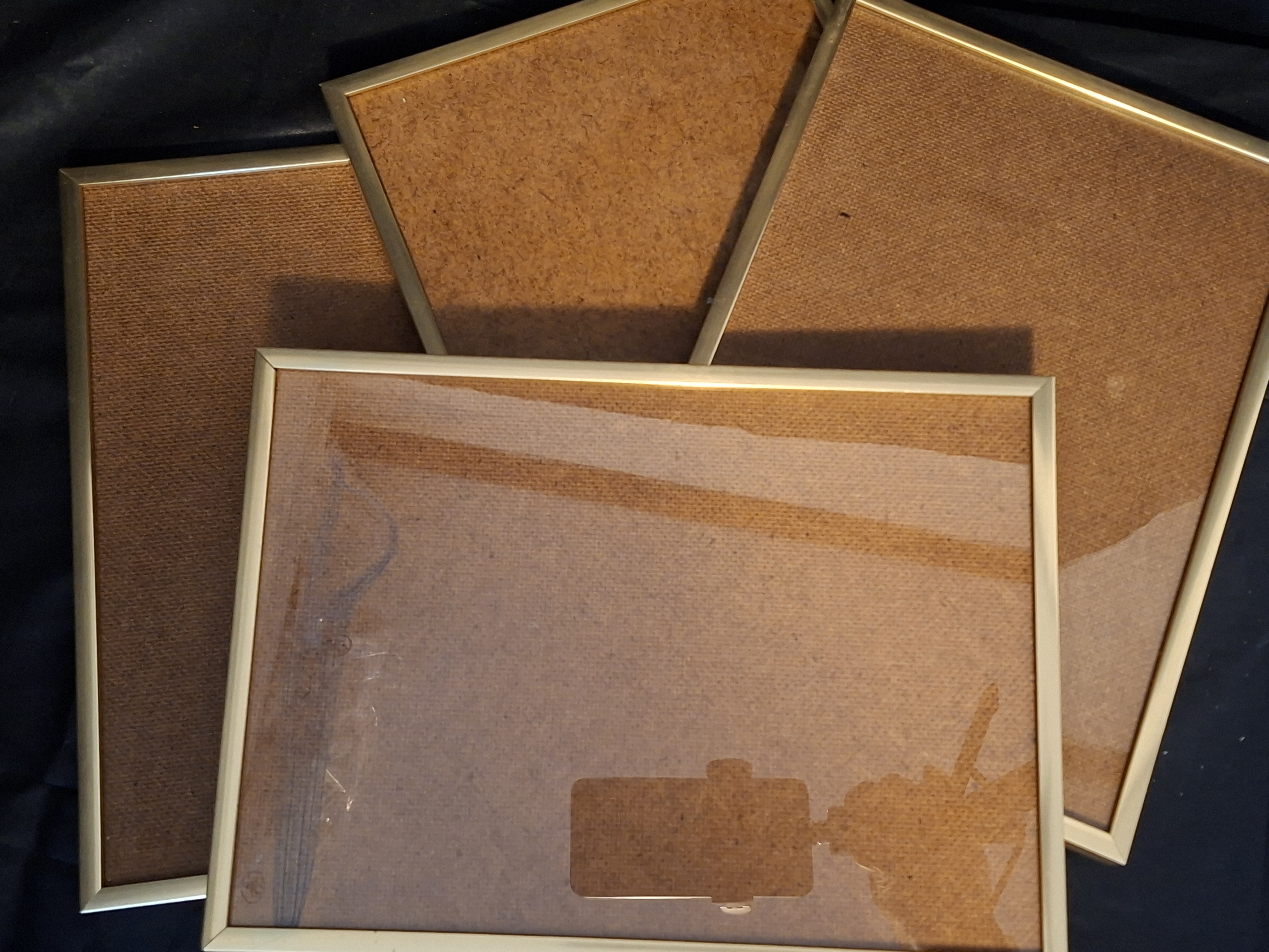 Complete set van vier identieke, minimalistische fotolijsten in een elegante goud/messing kleur. Het strakke, dunne profiel past perfect in een moderne inrichting en is ideaal voor het creëren van een fotowand.