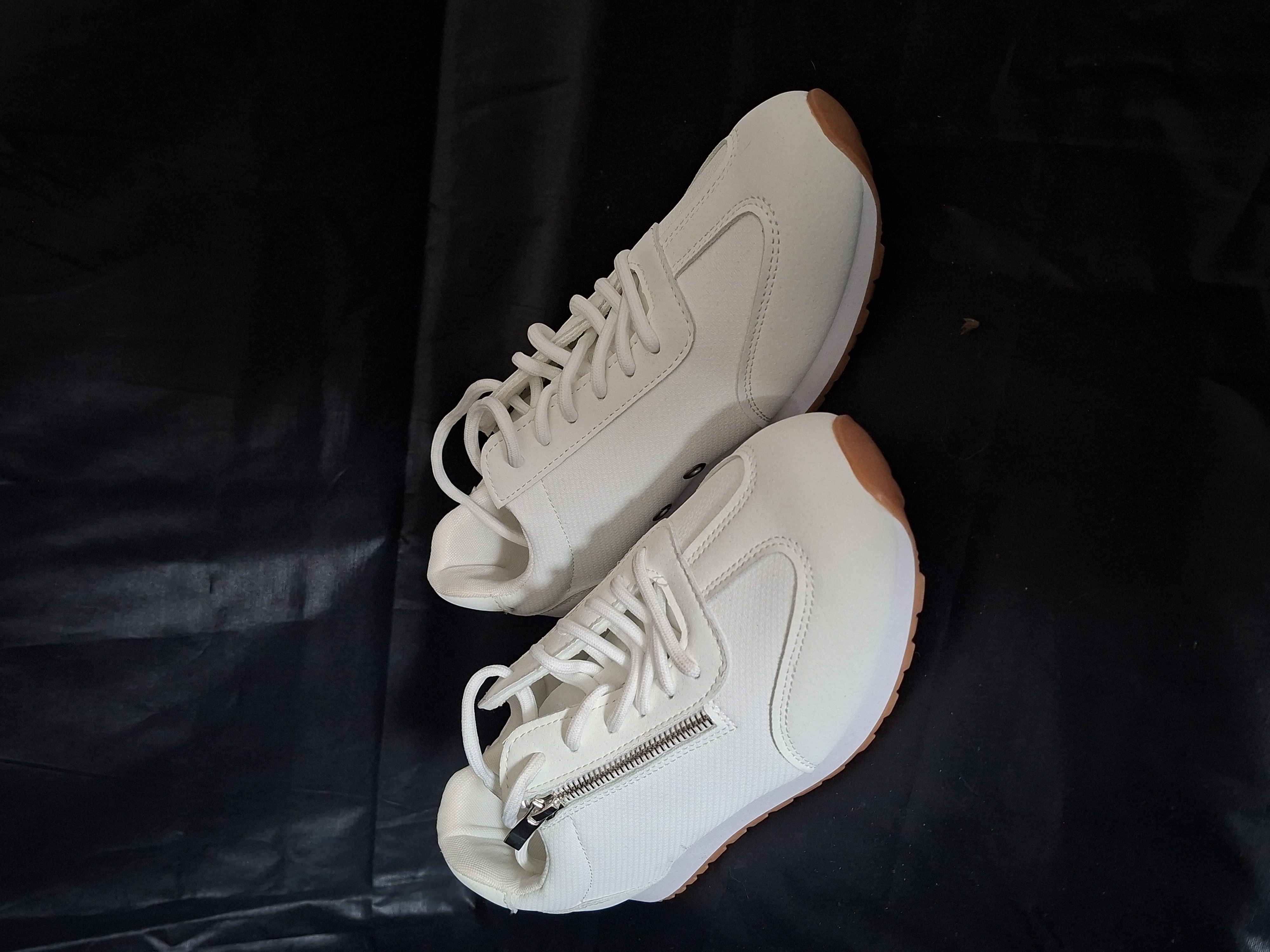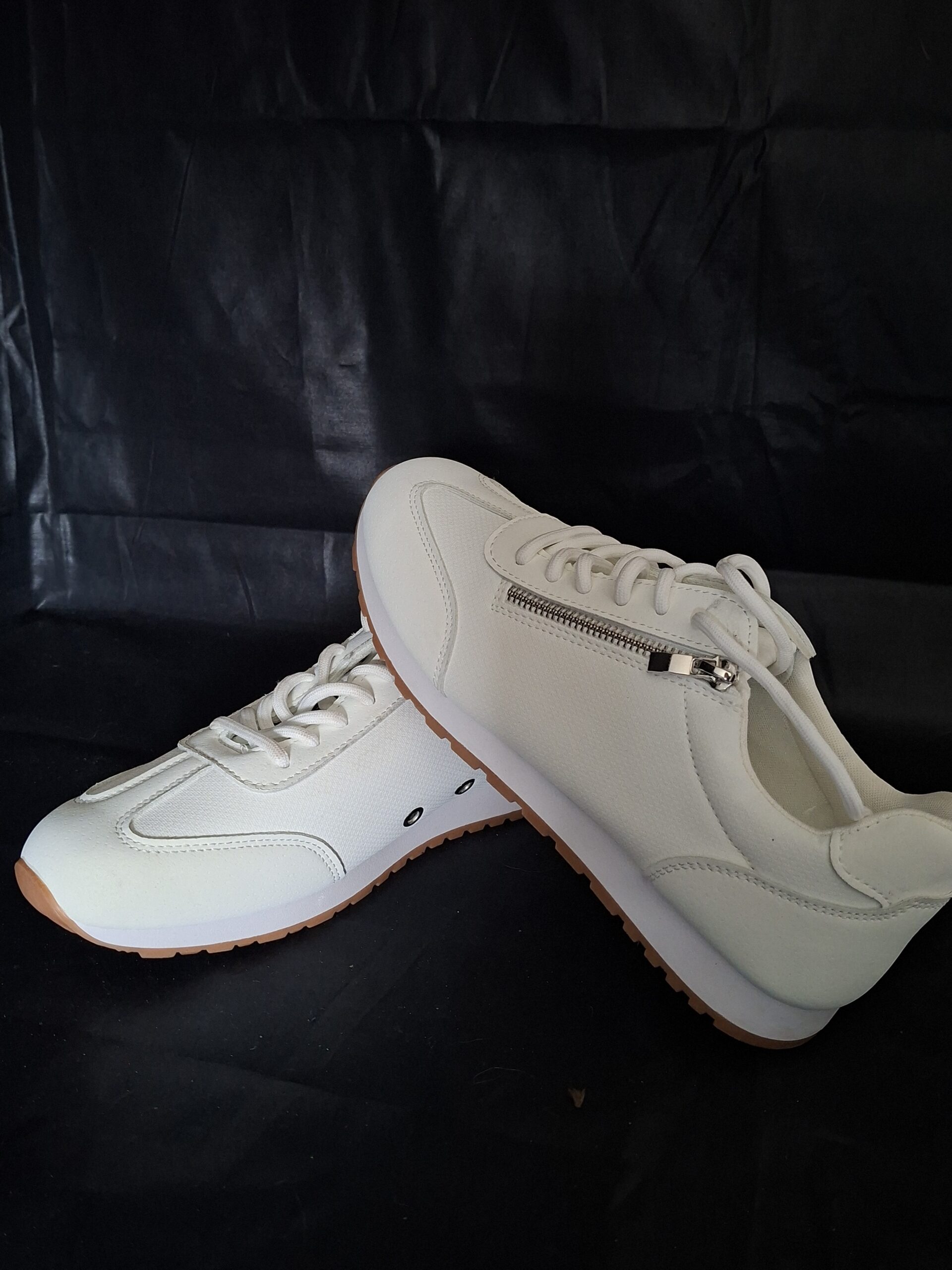 Stijlvolle witte sneakers met opvallend rits detail aan zijkant. Maat 39. Volledig wit met beige/gum zool. Vetersluiting. Decoratieve zilveren rits aan zijkant. Sportieve retro look. Zachte binnenzool. Made in China. Perfect voor casual dagelijks gebruik.