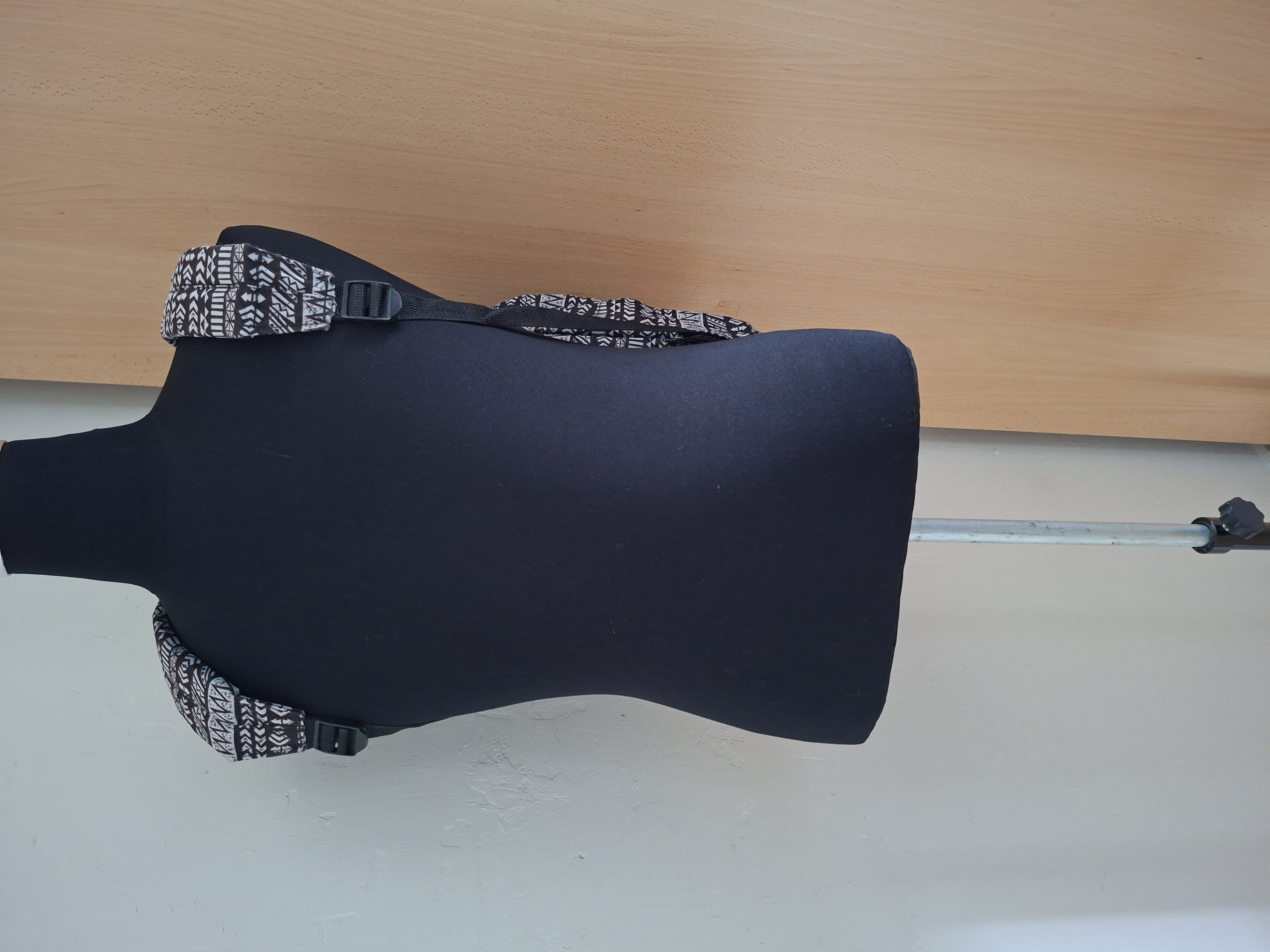 Praktische rugzak met opvallende zwart-wit Azteken tribal print. Hoofdvak met rits biedt ruimte voor boeken, laptop of kleding. Extra voorvak met rits voor kleine spullen zoals telefoon en portemonnee. Zijvakken voor fles of paraplu. Verstelbare gewatteerde schouderbanden zorgen voor comfortabel dragen. Handige draagbeugel voor ophangen of vasthouden. Geschikt voor school, werk, sport, reizen of dagelijks gebruik. Onderkant toont gebruikssporen door normaal gebruik maar verder in goede staat zonder beschadigingen.