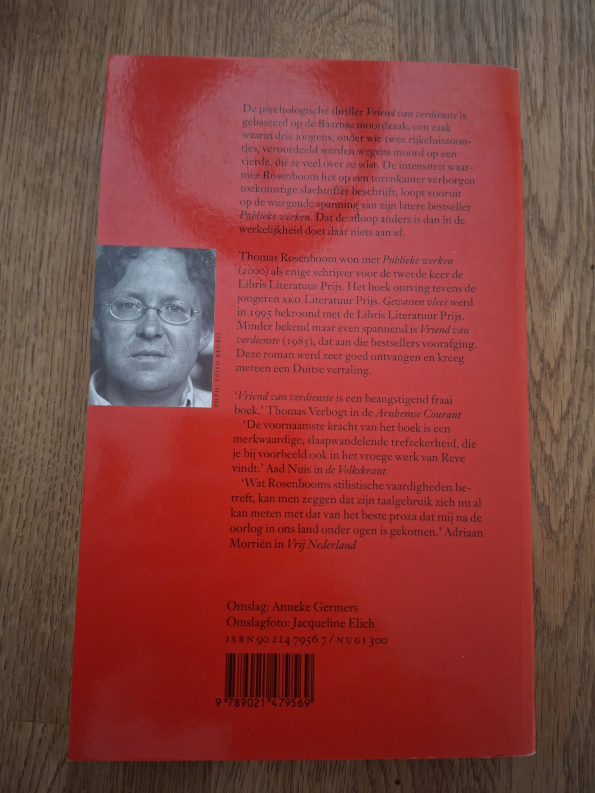 Vriend van verdienste van Thomas Rosenboom is een meesterlijke psychologische thriller en een van de belangrijkste Nederlandse romans van de jaren negentig. Thomas Rosenboom won met Publieke werken (2000) als enige schrijver voor de tweede keer de Libris Literatuur Prijs. Het boek ontving tevens de jongeren AKO Literatuur Prijs. Gewissen vlees werd in 1995 bekroond met de Libris Literatuur Prijs.