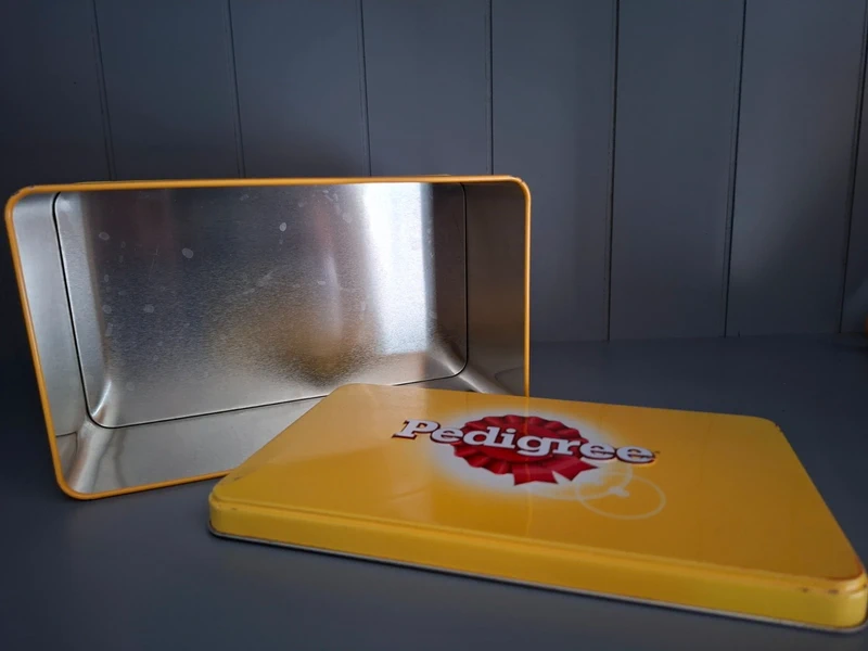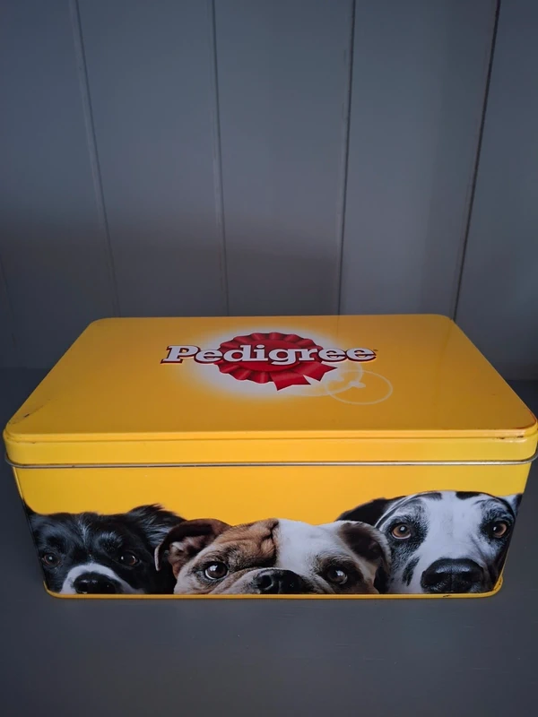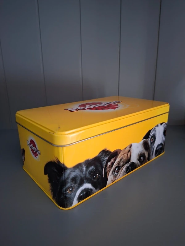 Een vrolijk en praktisch voorraadblik voor de echte hondenliefhebber! Dit rechthoekige, metalen blik in de kenmerkende gele kleur van Pedigree is perfect voor het bewaren van hondensnoepjes, maar kan natuurlijk ook gebruikt worden voor andere spullen. De zijkanten zijn versierd met de schattige, nieuwsgierige koppen van verschillende hondenrassen.