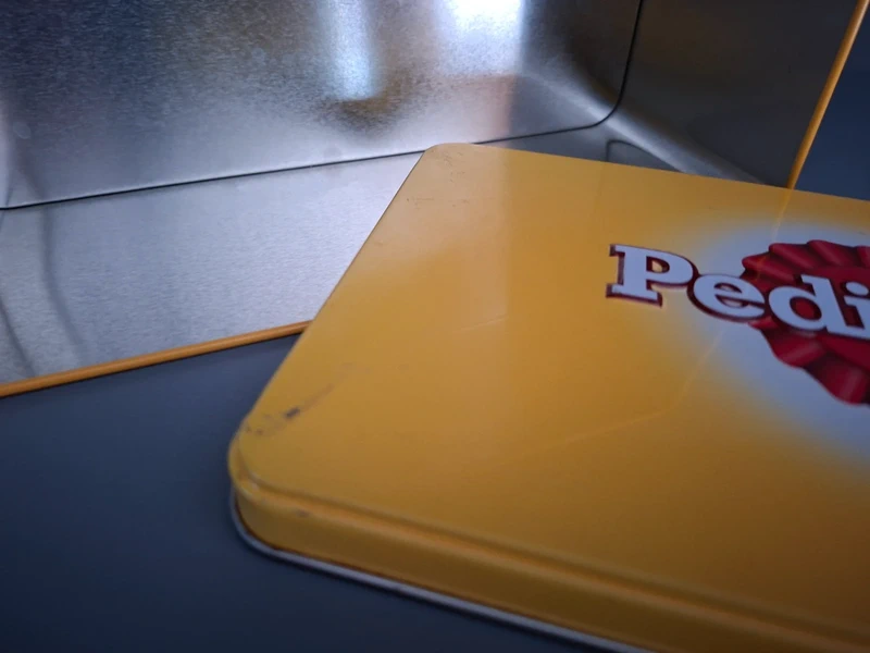 Het blik is in een goede, gebruikte staat. Zoals te zien op de foto’s, zijn er een paar kleine krasjes en deukjes op het deksel en de randen, wat past bij de leeftijd van een vintage blik. De binnenkant is schoon en netjes.