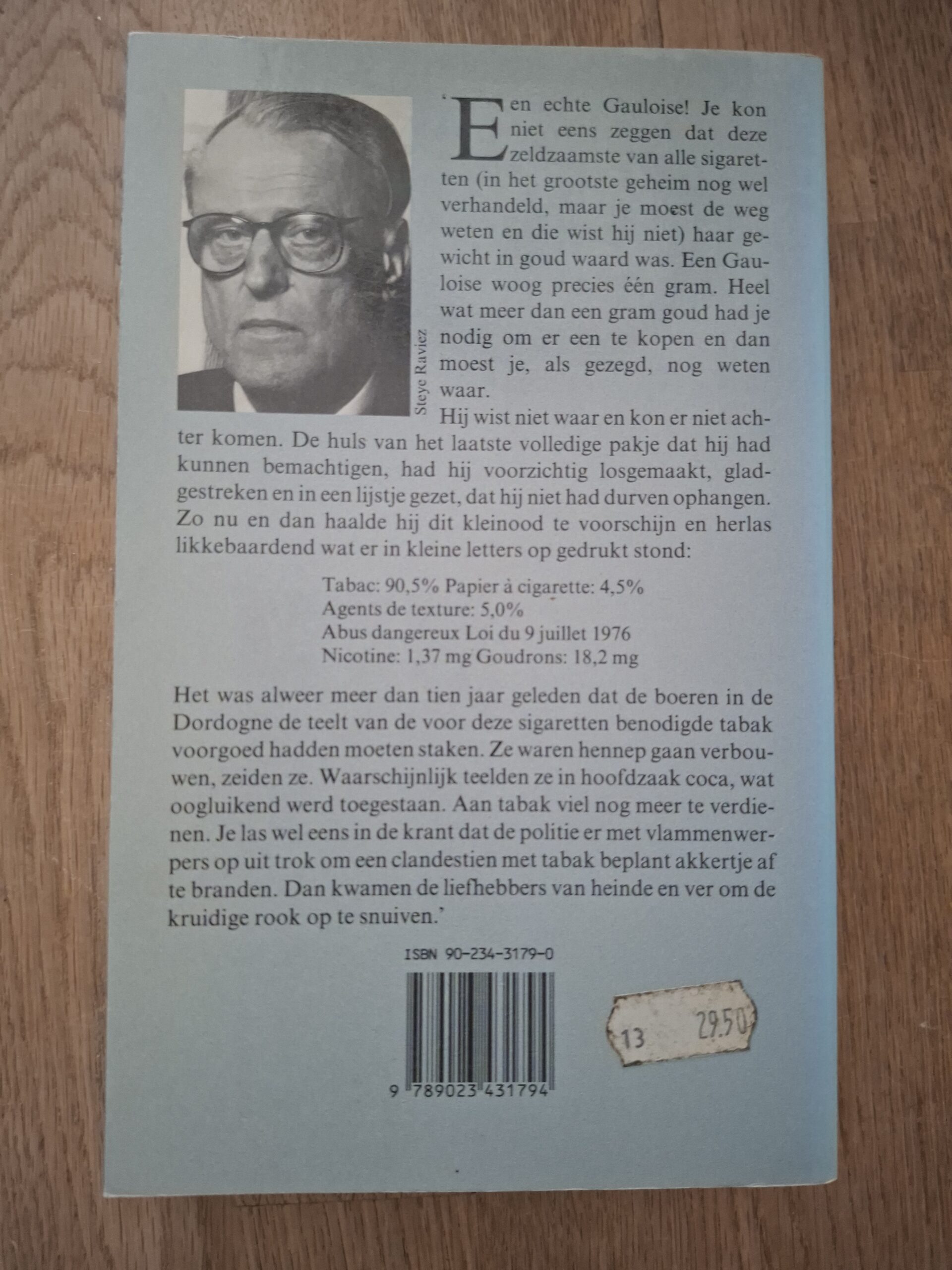 Hij wist niet waar en kon er niet achter komen. De huls van het laatste volledige pakje dat hij had kunnen bemachtigen, had hij voorzichtig losgemaakt, gladgestreken en in een lijstje gezet, dat hij niet had durven ophangen. Zo nu en dan haalde hij dit kleinood te voorschijn en herlas likkebaardend wat er in kleine letters op gedrukt stond: Tabac: 90,5% Papier à cigarette: 4,5% Agents de texture: 5,0% Abus dangereux Loi du 9 juillet 1976 Nicotine: 1,37 mg Goudrons: 18,2 mg.