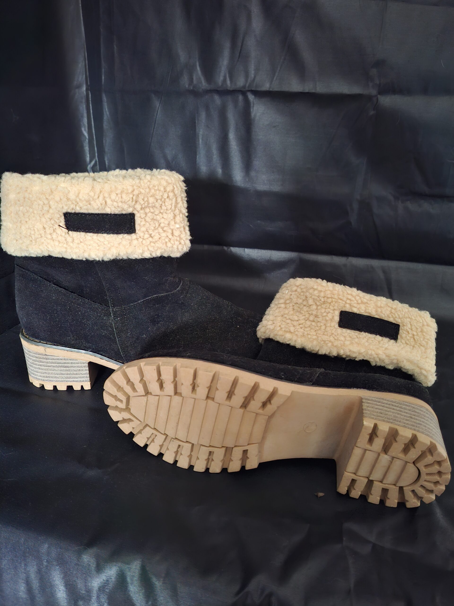 Warme winterlaarzen in zwart suède met zachte teddy voering. Maat 39 maar let op: smalle schachtopening dus valt kleiner. Zwart suède met beige teddy voering aan binnenzijde. Omslag mogelijk voor teddy look. Blokhak circa 5cm. Track sole profiel voor grip. Nooit gedragen. Perfect voor winter.