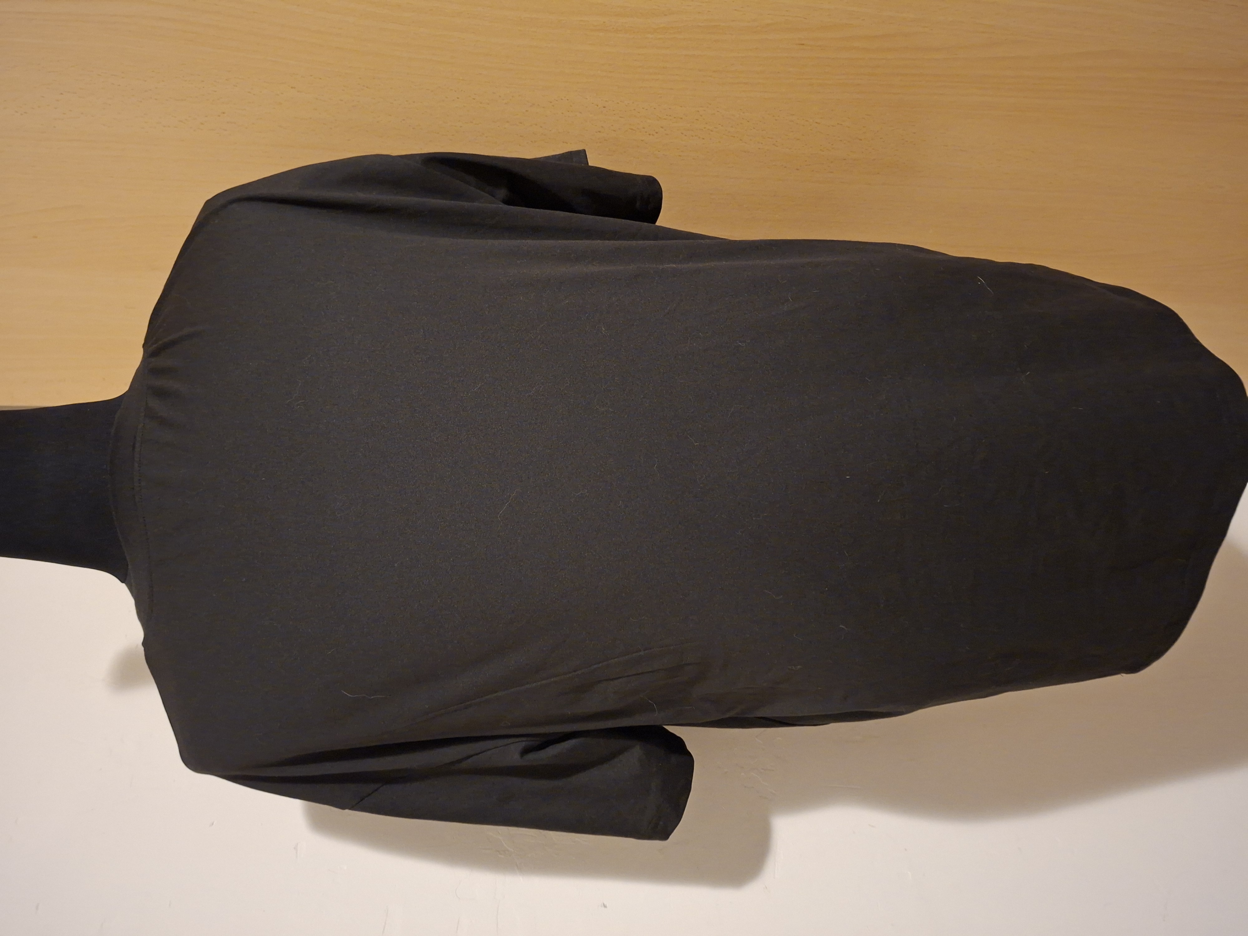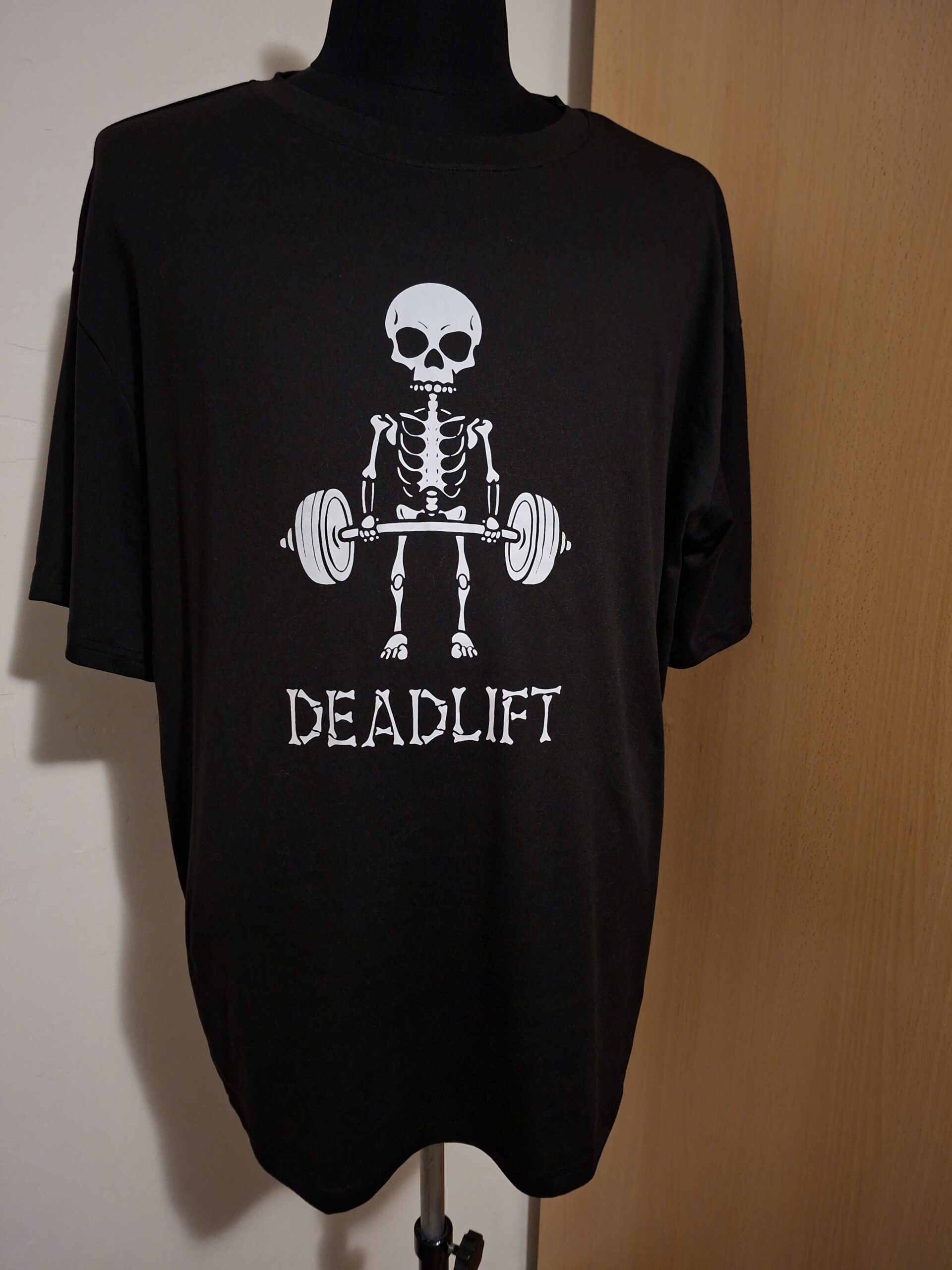 Zwart oversized t-shirt met grote witte print voor gym lovers. Voorkant: skelet met halter en tekst “DEADLIFT”. Achterkant: geen print. Maat XXL. Materiaal: 95% Polyester, 5% Spandex. Made in China. No Label. Perfect voor fitness en gym liefhebbers.