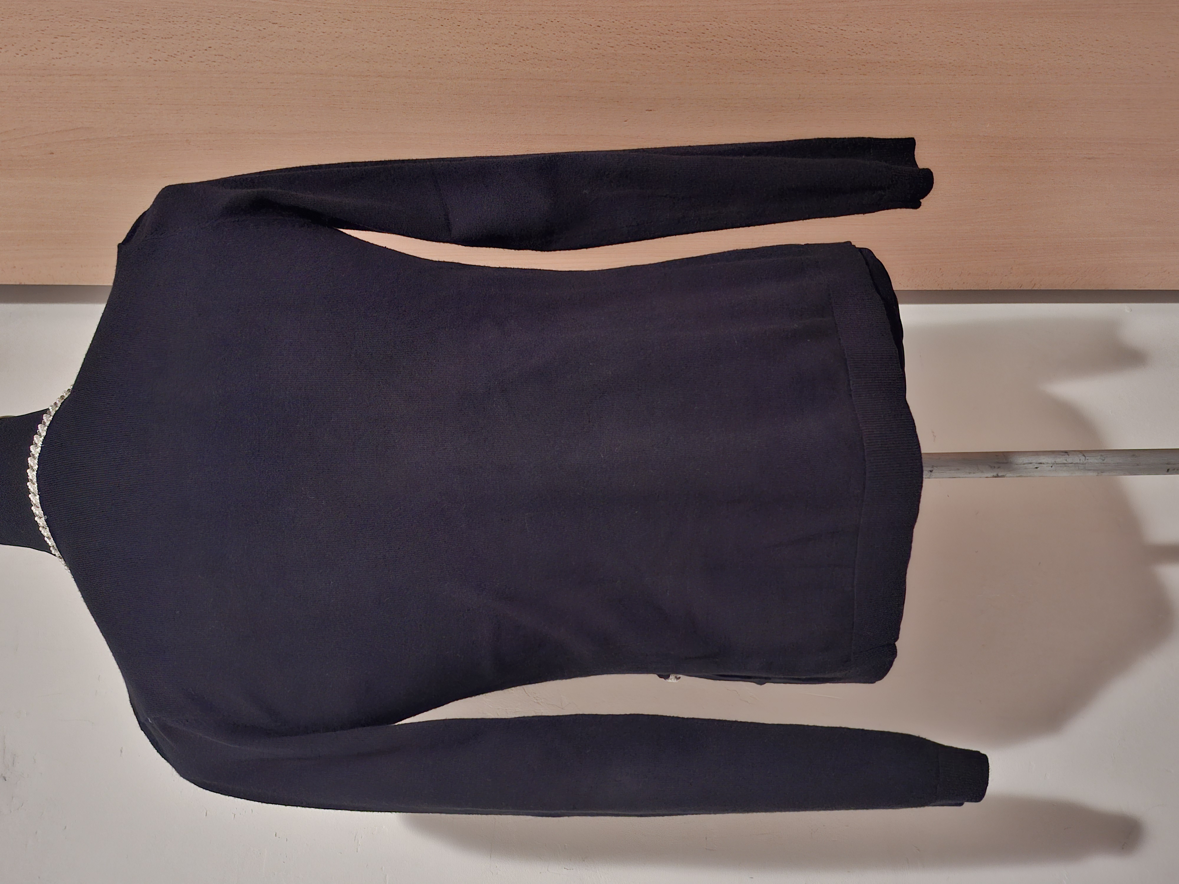 Zwart elegant vestje met prachtige parelrand afwerking. Chanel stijl. Maat S/36. Parelrand langs voorkant, kraag, zakken en mouwen. Twee steekzakken met parelrand. Lange mouwen. Klassiek en luxe model. Perfect voor zakelijk of feestelijke gelegenheden.