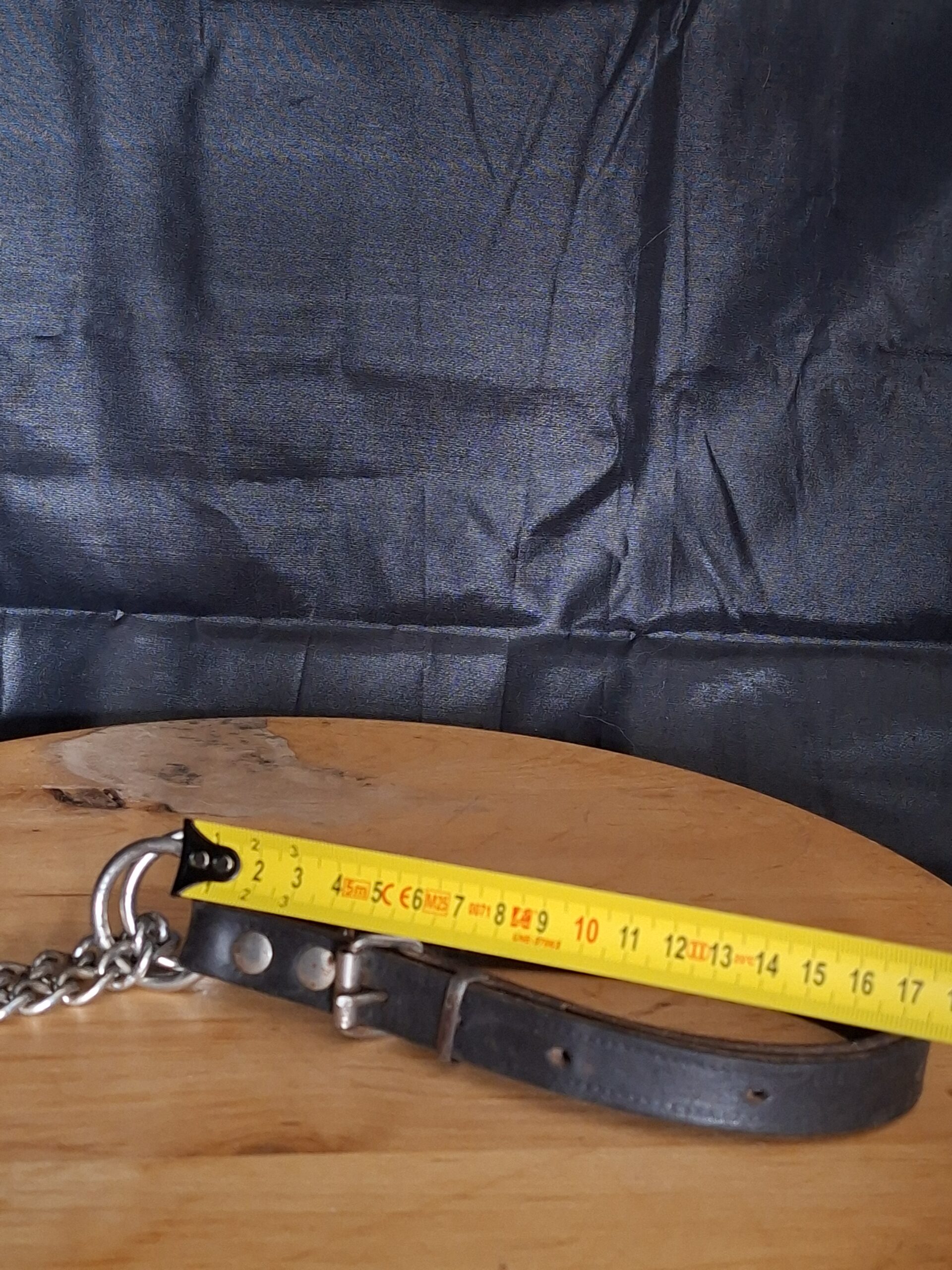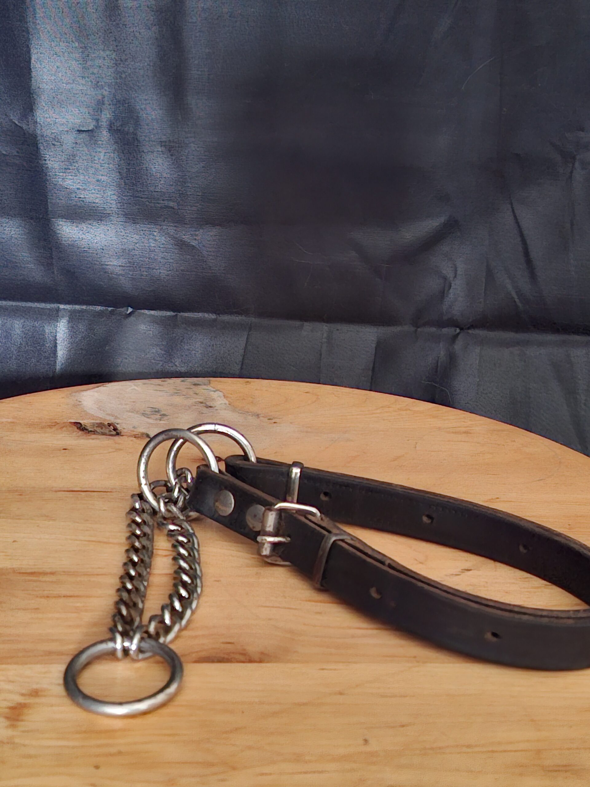 Zwarte leren hondenhalsband met metalen ketting. Verstelbaar. Voor kleine tot middelgrote honden.